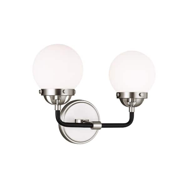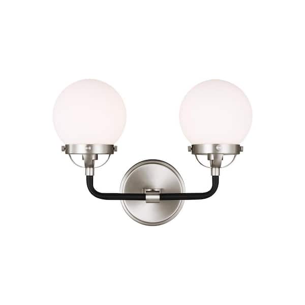 Cafe 17 in. W 2-Light Brushed Nickel Vanity Light with Etched/White Glass Shades and Matte Black Frame Accents