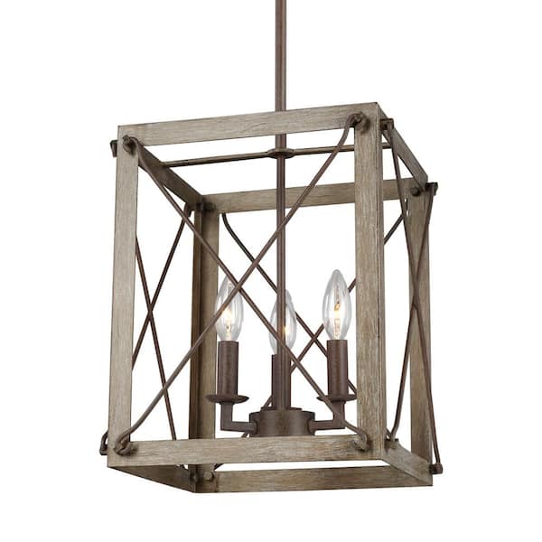 Thornwood Small 3-Light Washed Pine and Weathered Iron Accents Hall/Foyer Pendant with Dimmable Candelabra LED Bulb