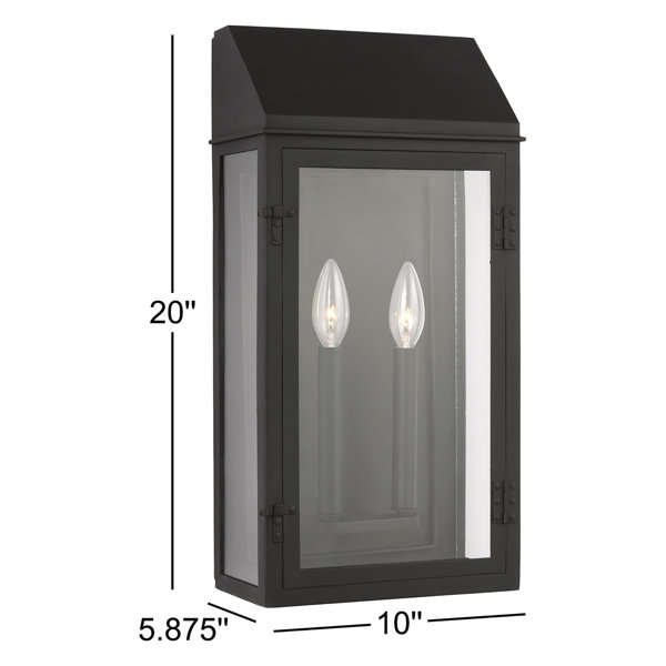 The Winnetka outdoor family by Chapman & Myers is crafted of steel with a clear glass front, and black candle tubes.