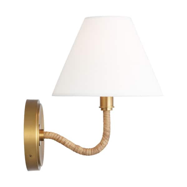 Laguna 7 in. 1-Light Burnished Brass Transitional Wall Sconce with White Linen Fabric Shade