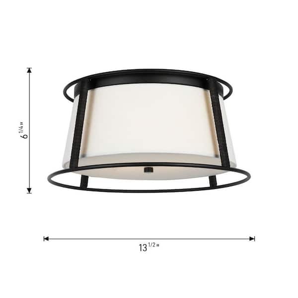 Cortes 13.5 in. W x 6.25 in. H 2-Light Midnight Black Ceiling Flush Mount with Etched White Glass and White Fabric Shade