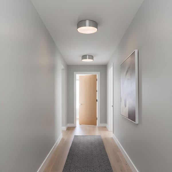 • Modern flush mount with a metal finish and an elegant glass shade