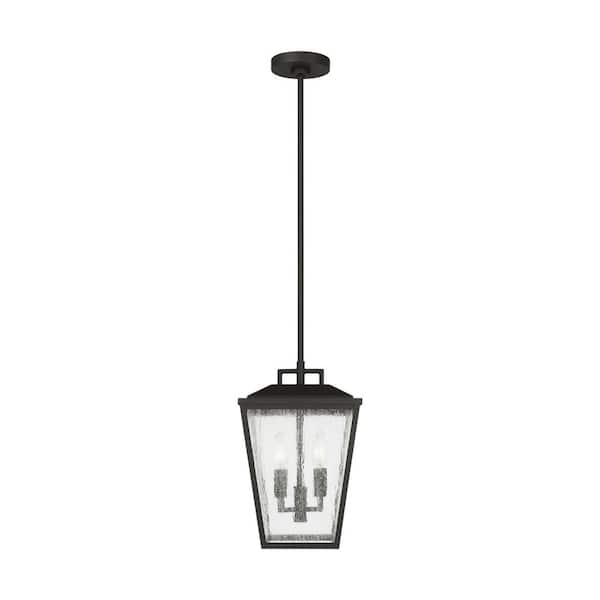 Kennewick 9 in. W x 14.125 in. H 2-Light Textured Black Outdoor Pendant Light with Distressed Seeded Glass Shades