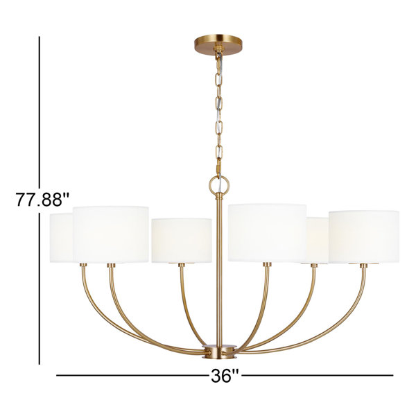 The Tanyel Medium chandelier by Birch Lane™ in burnished brass is a wide playful chandelier with arched lines and wide, graphically taped shades. This simple and graphic chandelier would be great over a dining table or nook, as well as in a living room scenario.