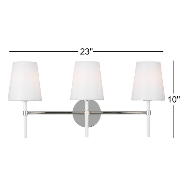 Shine some light on your morning and evening routine with this 3-light vanity fixture. Its steel frame with a gleaming finish showcases a round backplate and a sleek arm that holds on to vertical poles, creating a contemporary look over your bathroom sink or in your hallway. We love the three glass shades in a crisp white finish. Each one disperses the light from a single candelabra-based bulb up to 60W, which is sold separately. Plus, this vanity light is dimmable so you can adjust the brightness throughout the day.