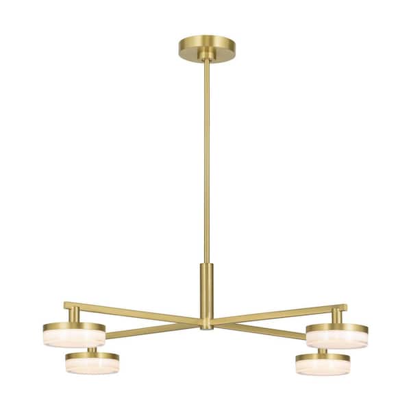 Studio Khan Extra Large 4-Light Burnished Brass Integrated LED Chandelier With Silk Screen White and Clear Glass Shades