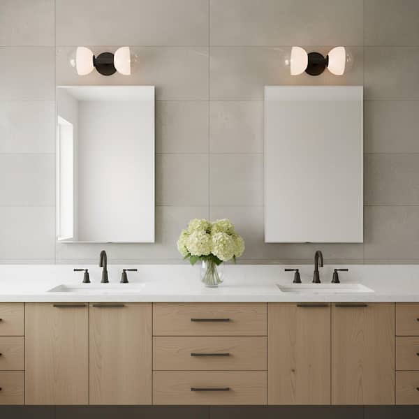 Torian 15.375 in. 2-Light Aged Iron Bathroom Bedroom Vanity Light Wall Fixture With Milk Clear Glass Mix Shade