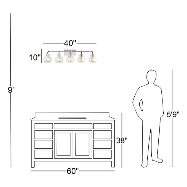 This 5-light vanity light features a clear seeded glass shade that subtly diffuses light while allowing the exposed bulb to be a central design element of this sleek fixture. It's made from metal in the finish of your choice and is mounted on a circular backplate with exposed rivet details for a nod to industrial-inspired style. The curved arm supports the five glass shades, each of which houses a single 75W bulb inside (not included). This hardwired vanity is safe to use in damp locations and compatible with dimmer switches, so it's perfect for setting the mood for morning showers, evening baths, and everything in-between. Plus, it can be mounted either up or down for added versatility.