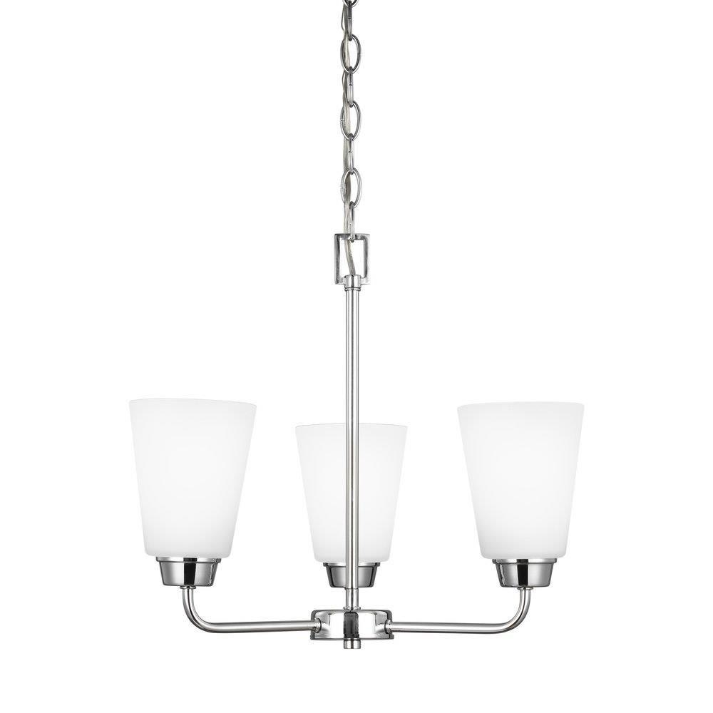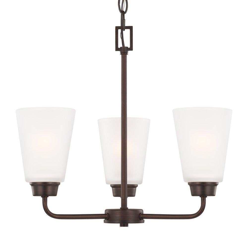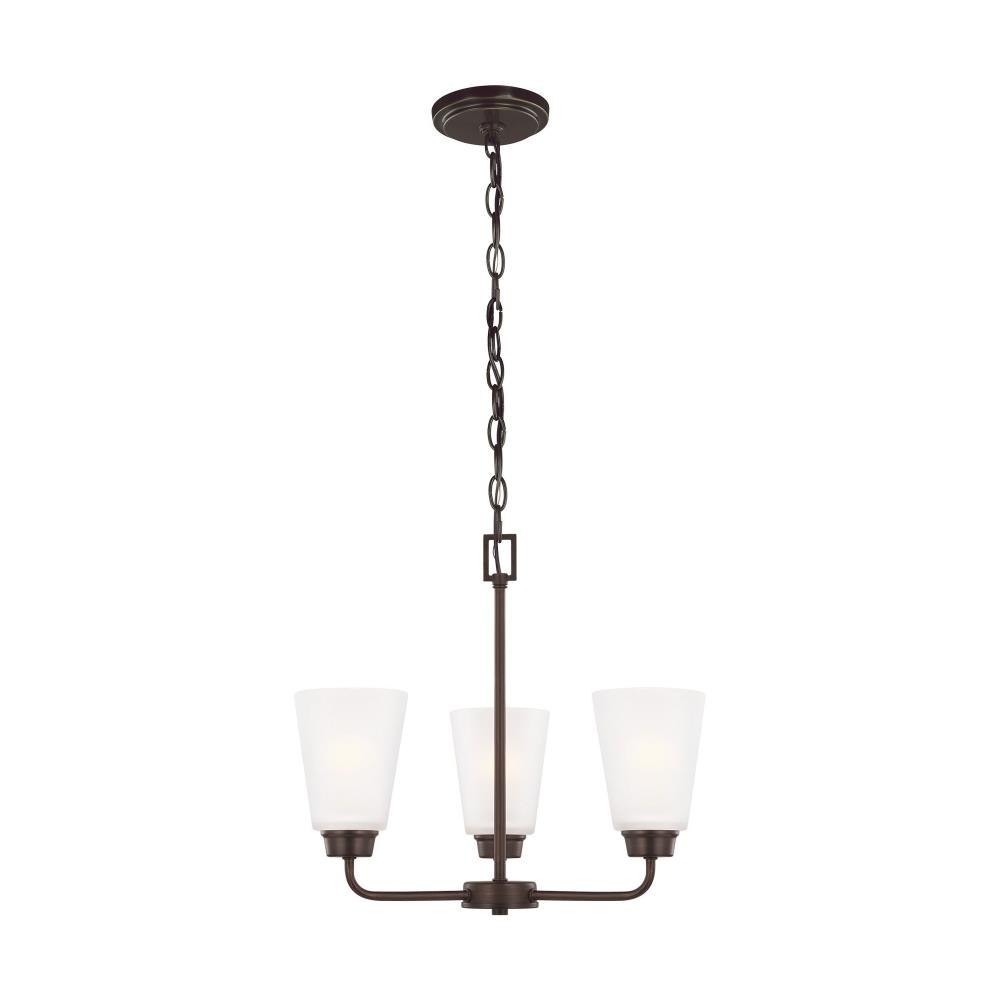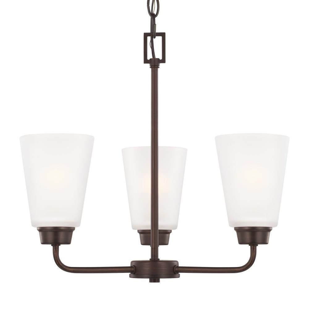The Kerrville three light single tier chandelier in bronze enhances the beauty of your home with ample light and style to match today's trends. With a simple, airy appearance, the Kerrville lighting collection by embraces its modern design roots while enhancing virtually any homes decor. Tubular steel arms extend outward and curve to present beautiful tapered, Satin Etched glass shades. The collection has a Brushed Nickel, Burnt Sienna or Chrome finish and offers three-, five- and nine-light chandeliers, a one-light mini pendant, one- and three-light pendants, a two-light semi-flush mount which can convert to a pendant, and one-, two-, three- and four-light bath fixtures. Incandescent and ENERGY STAR-qualified LED lamping are available; all fixtures are California Title 24 compliant.