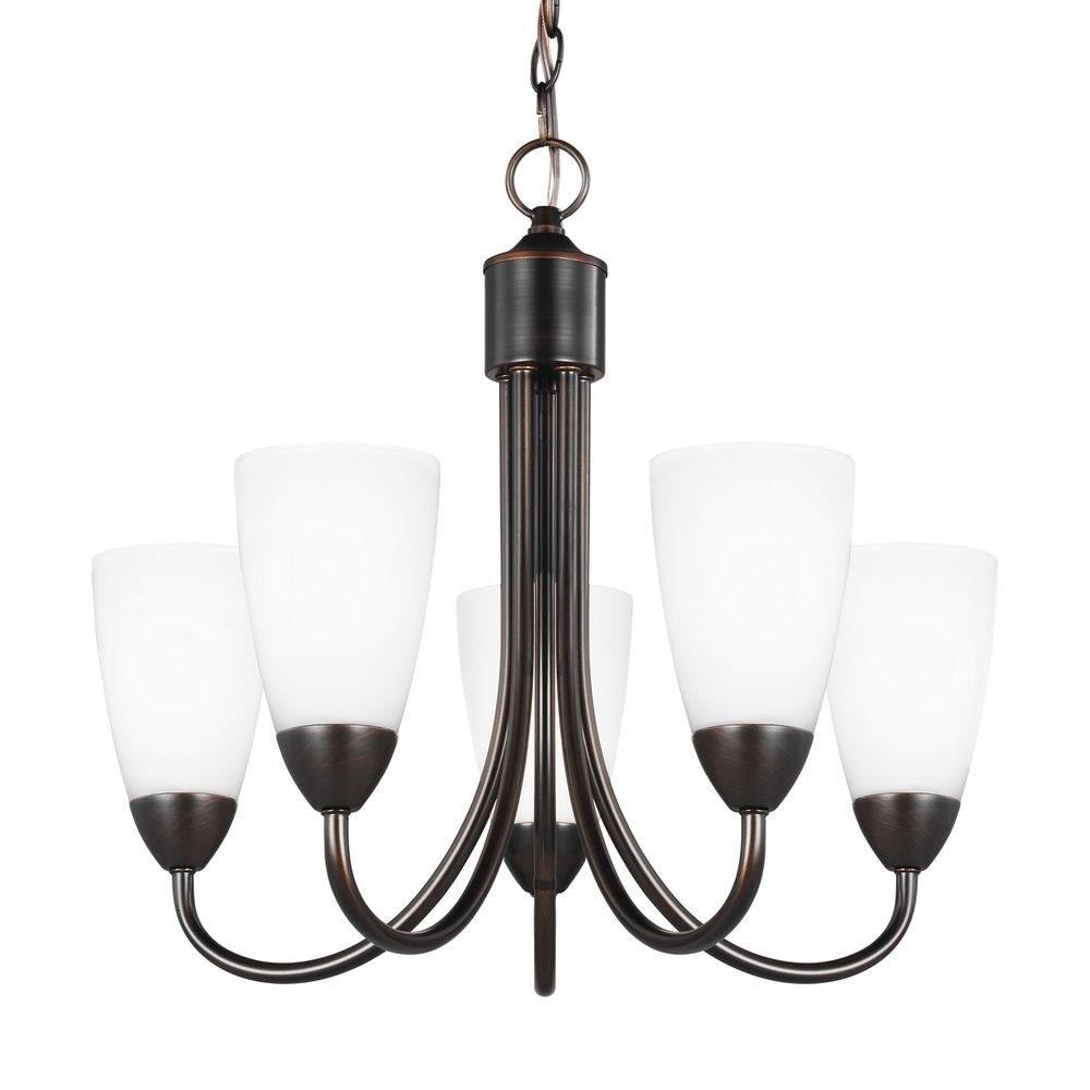 The Seville five light single tier chandelier in bronze enhances the beauty of your home with ample light and style to match today's trends. The Seville collection represents commitment to high style at a sharp price. The modernist design is epitomized by the teardrop curves in the arms tipped by Etched glass diffusors throughout the chandeliers and bath fixtures. The collection offers a "whole home" lighting solution in every imaginable category. The assortment includes nine-light, five-light, and three-light chandeliers (either with up-light or down-light), pendants in four sizes as well as one-light, two-light, three-light , four-light and five-light wall/bath fixtures. Install a stylish and elegant addition to any room in the house. Seville is offered in Brushed Nickel and Burnt Sienna finishes.