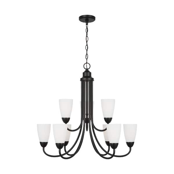 Seville 28.875 in. 9-Light Midnight Black Transitional Modern Hanging Chandelier with Etched White Glass Shades