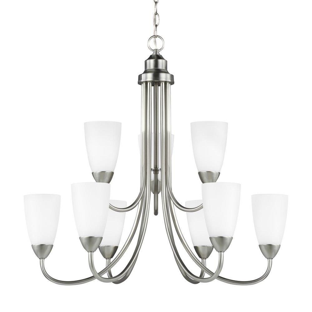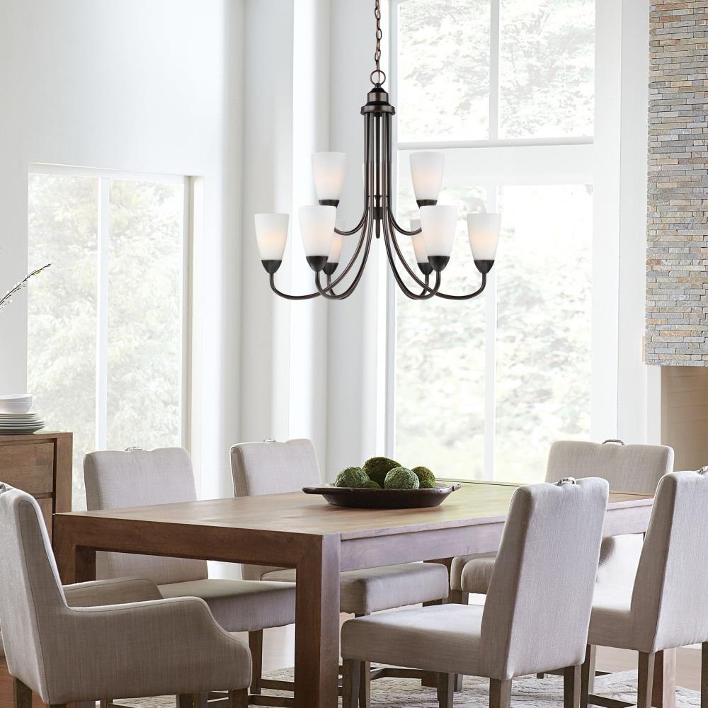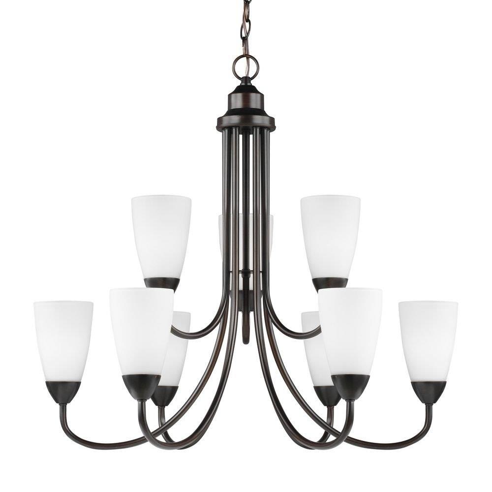 The Seville nine light multi tier chandelier in bronze is an ENERGY STARĀ® qualified lighting fixture that uses LED bulbs to save you both time and money. The Seville collection represents commitment to high style at a sharp price. The modernist design is epitomized by the teardrop curves in the arms tipped by Etched glass diffusors throughout the chandeliers and bath fixtures. The collection offers a "whole home" lighting solution in every imaginable category. The assortment includes nine-light, five-light, and three-light chandeliers (either with up-light or down-light), pendants in four sizes as well as one-light, two-light, three-light , four-light and five-light wall/bath fixtures. Install a stylish and elegant addition to any room in the house. Seville is offered in Brushed Nickel and Burnt Sienna finishes.Product Features and Benefits