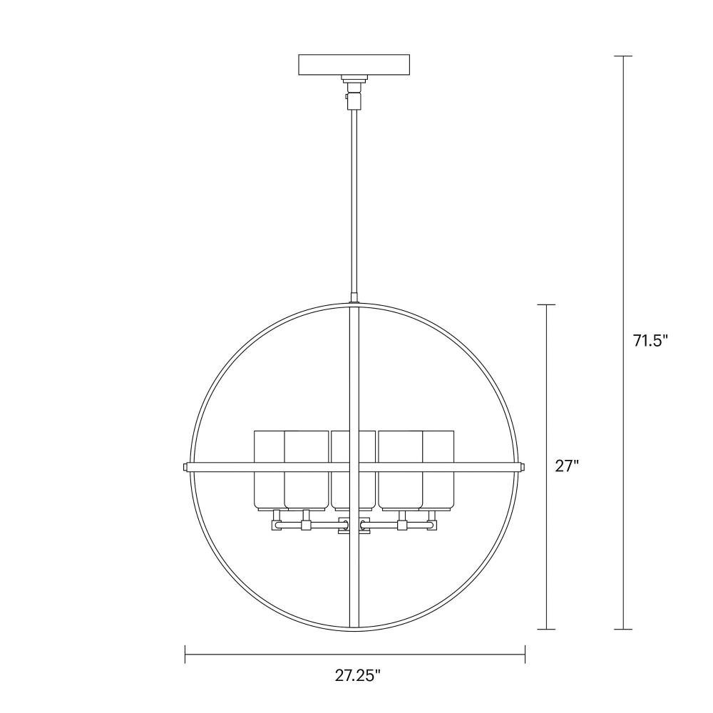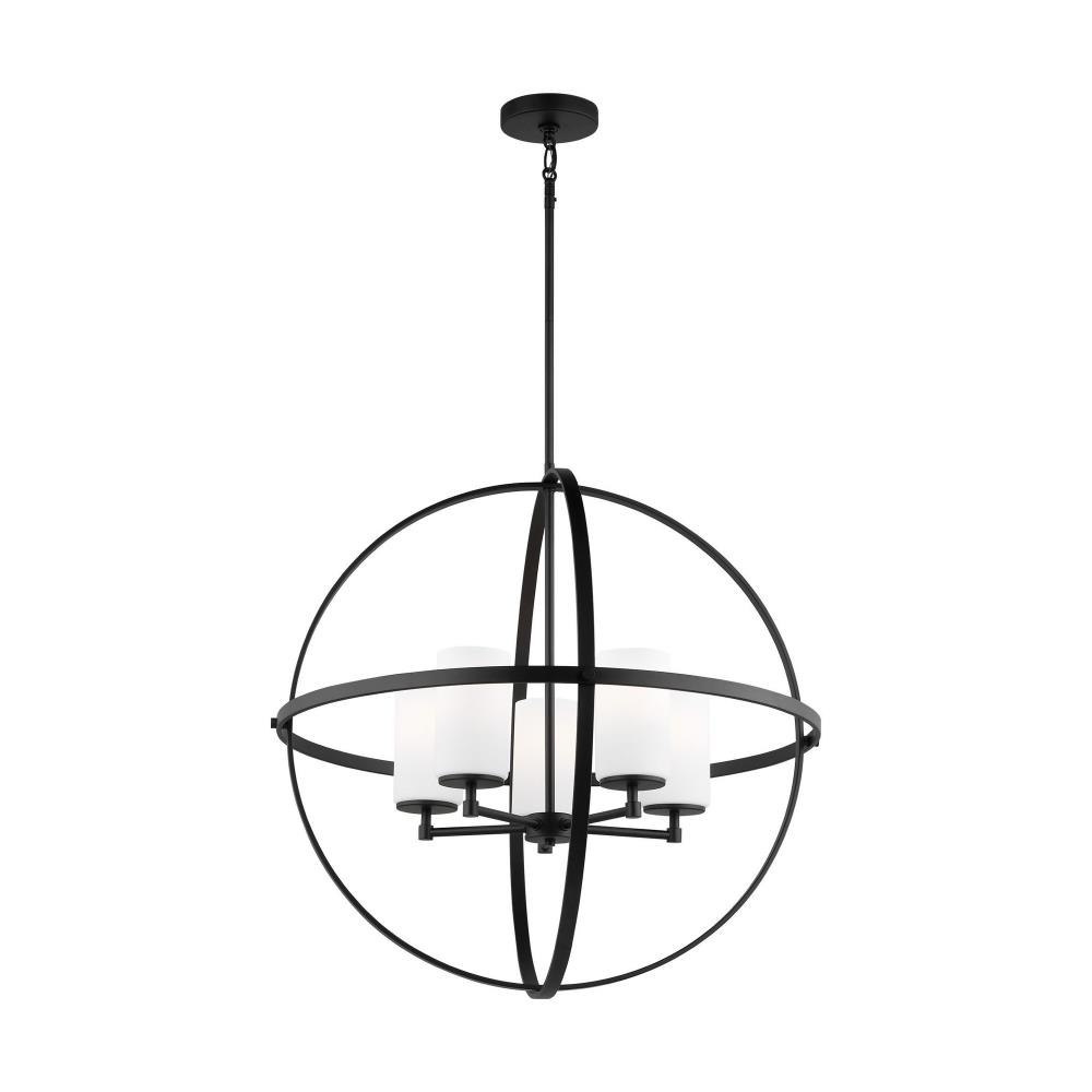 The Alturas five light single tier chandelier in Midnight Black is the perfect way to achieve your desired fashion or functional needs in your home. The silhouette of the modern Alturas lighting collection by features an interlocking, spherical steel frame, which harkens back to the Unisphere constructed for the 1964 New York World's Fair. The minimalist Alturas Collection draws the eye to the soft, warm glow of the light emitted from the cylindrical Satin Etched glass shades. The full assortment includes three-, five- and nine-light chandeliers, a one-light mini pendant, a three-light pendant, a two-light semi flush which is convertible into a pendant, and one-, two-, three- and four-light bath fixtures. All fixtures are offered in Brushed Oil Rubbed Bronze, Brushed Nickel, Midnight Black and Satin Bronze finishes, the bath fixtures are also offered in Chrome finish. Incandescent and ENERGY STAR-qualified LED lamping are available; all fixtures are California Title 24 compliant.Product Features and Benefits