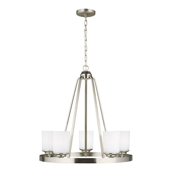 Kemal 5-Light Brushed Nickel Transitional Wagon Wheel Hanging Chandelier with Etched White Inside Glass Shades