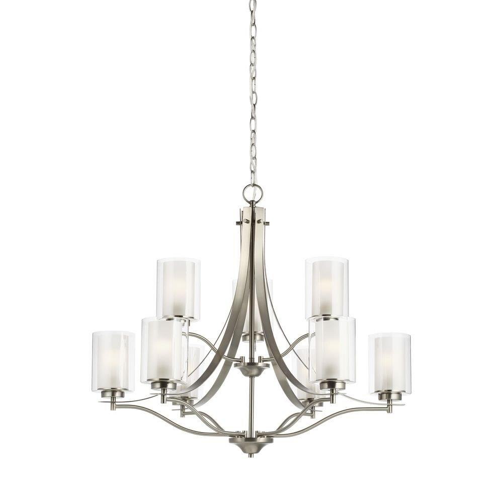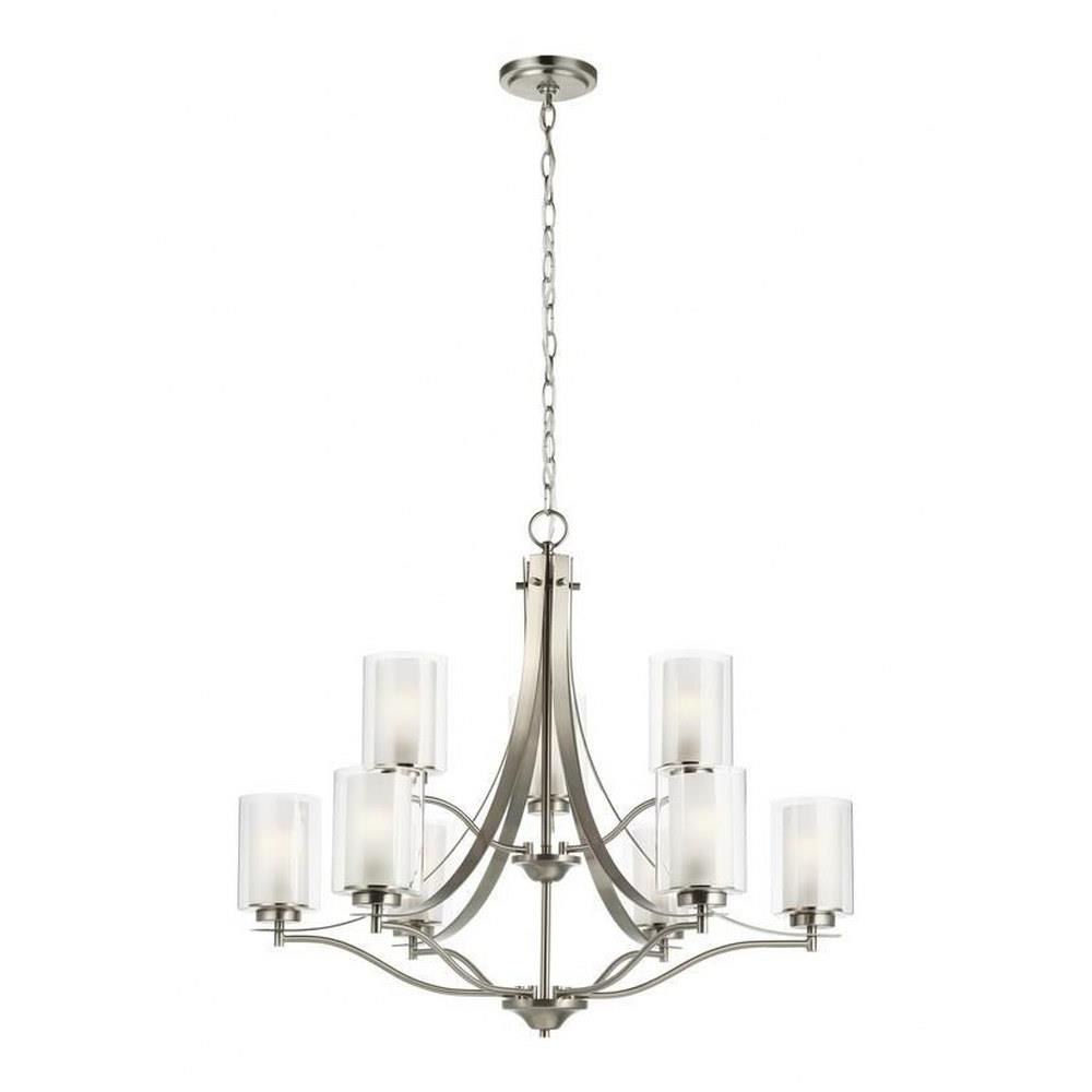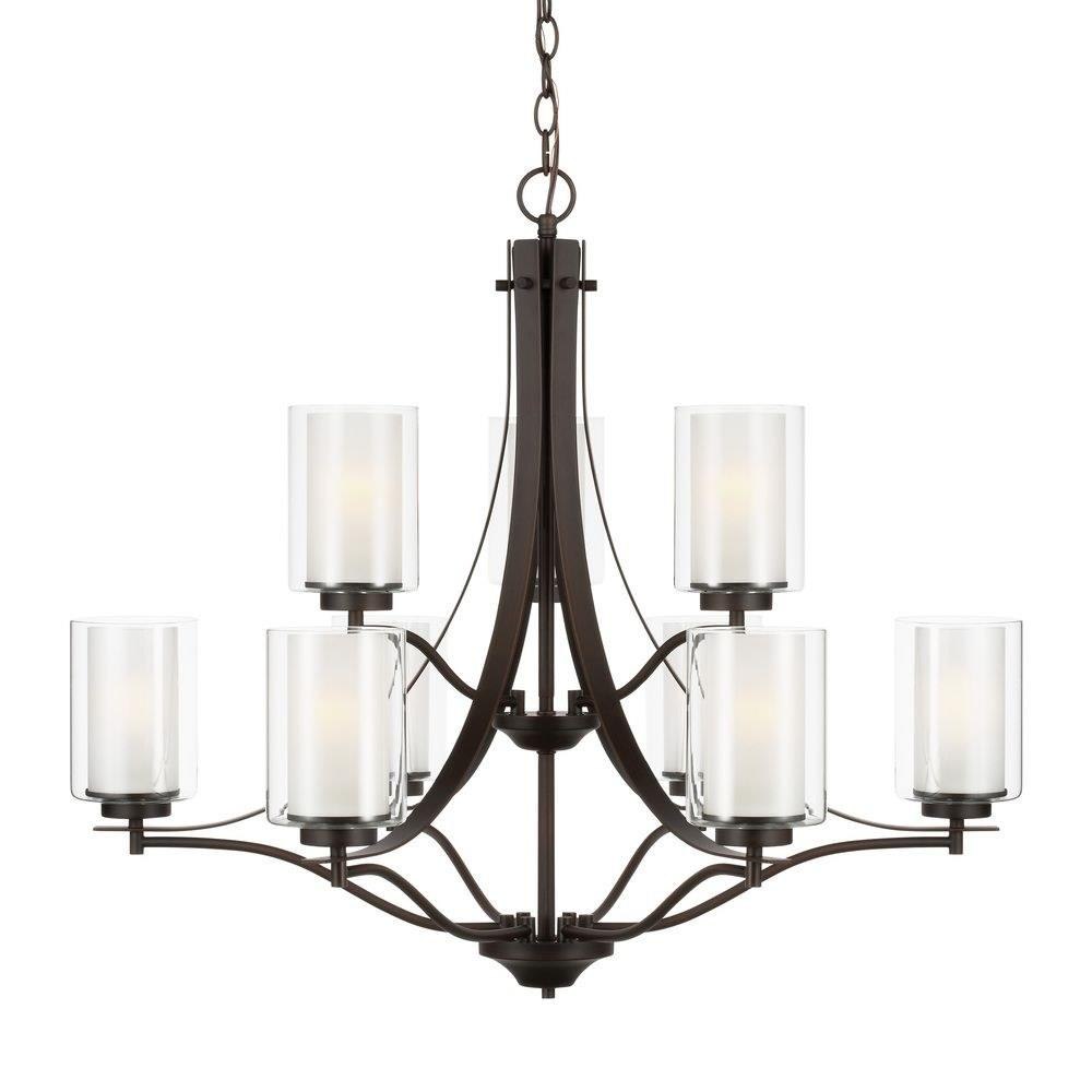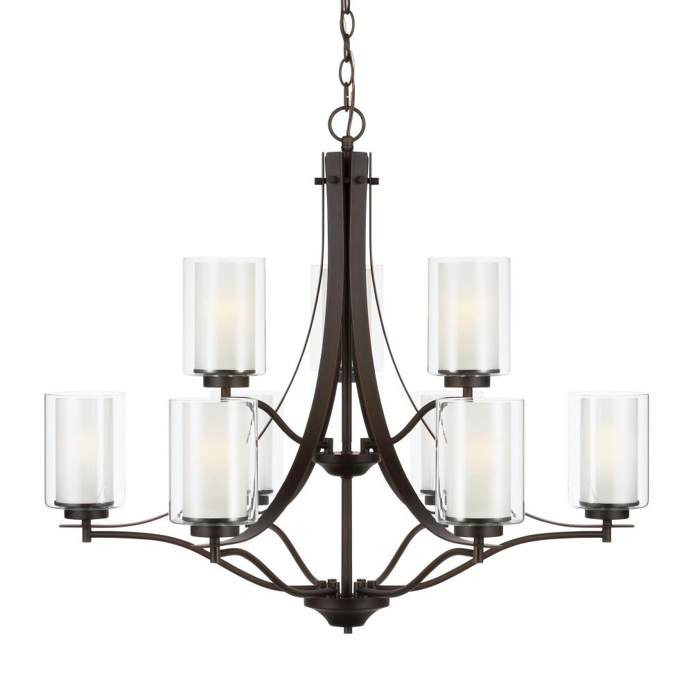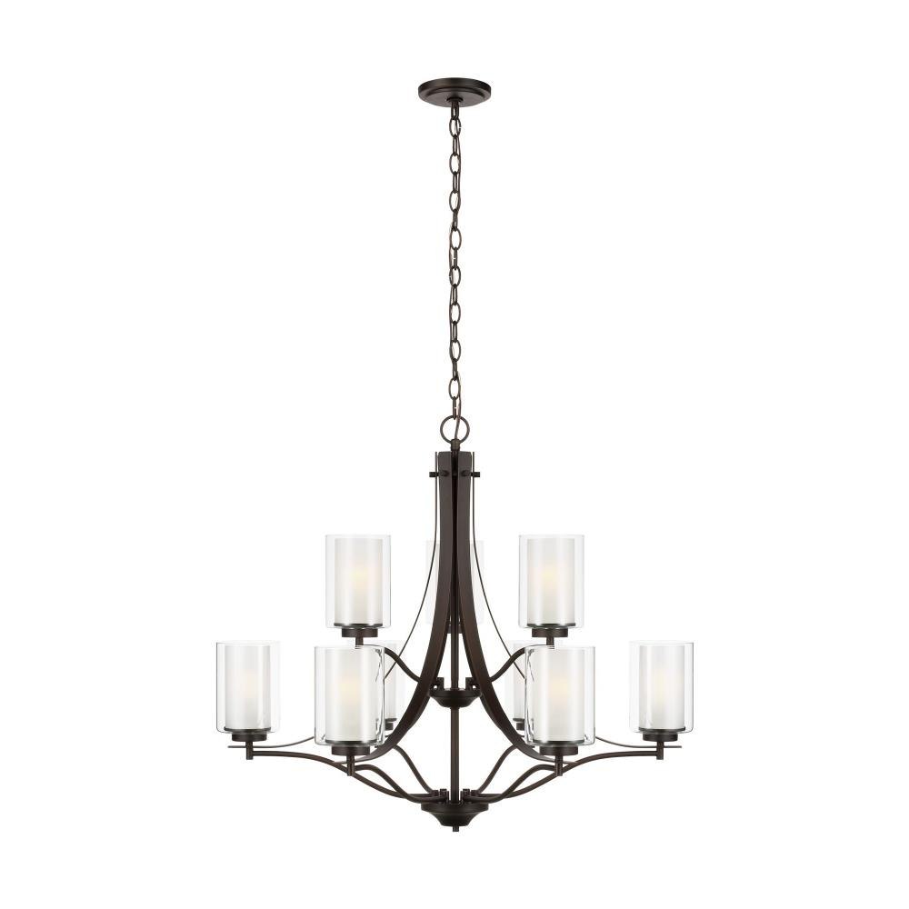 The Elmwood Park nine light multi-tier chandelier in bronze enhances the beauty of your home with ample light and style to match today's trends. Elmwood Park by has clear glass tube shades with an inner white glass element that softens the light and helps cast an even glow. A cylinder of etched glass is centered within a larger cylinder of clear glass which encircles each light bulb to create this stunning visual effect. The full assortment includes three-, five-and nine-light chandeliers, a four-light linear, one-light mini pendant, a three-light pendant, a two-light semi flush which is convertible into a pendant, and one-, two-, three- and four-light bath fixtures. All fixtures offered in either a Brushed Nickel or Brushed Oil Rubbed Bronze. Incandescent and ENERGY STAR-qualified LED lamping are available; all fixtures are California Title 24 compliant.Product Features and Benefits