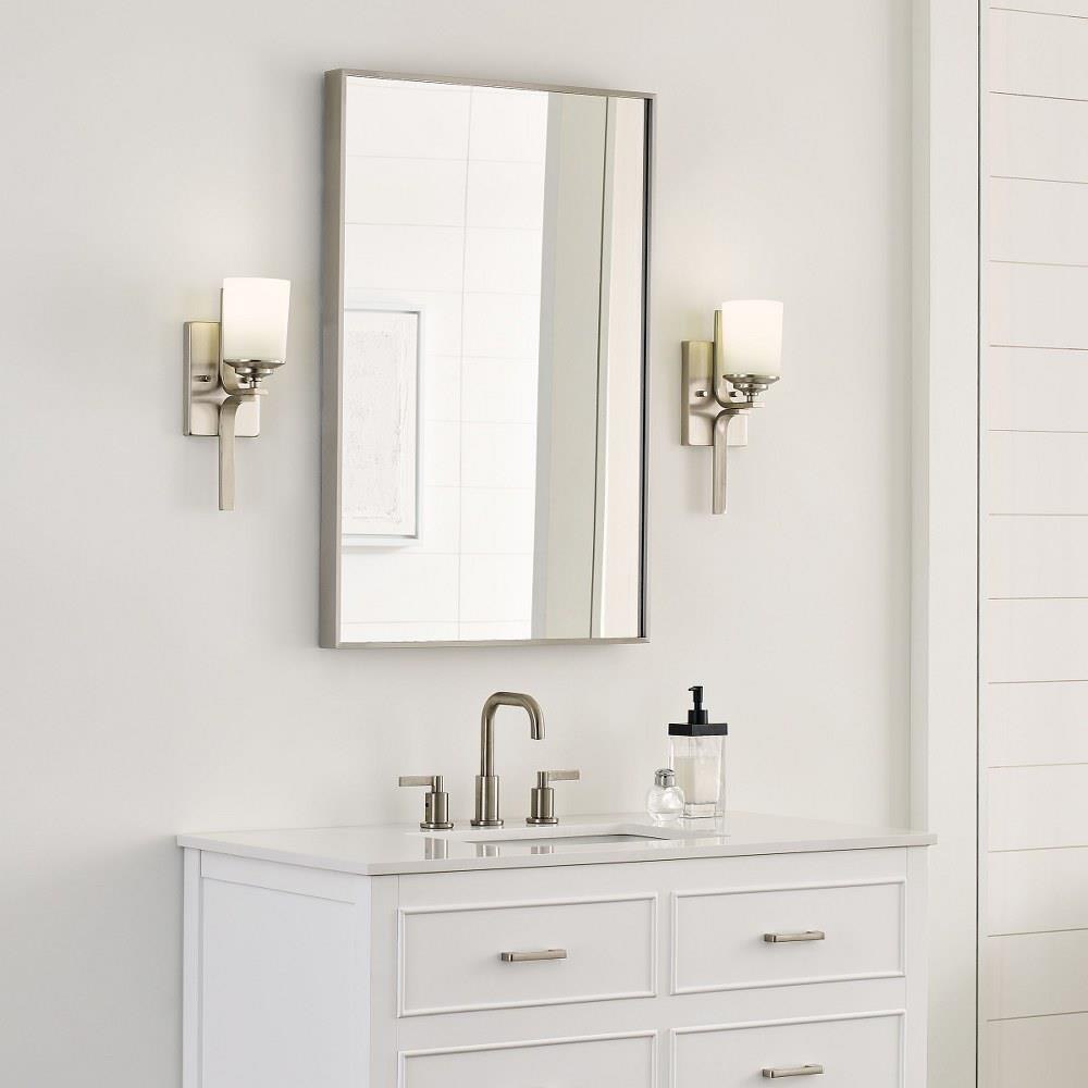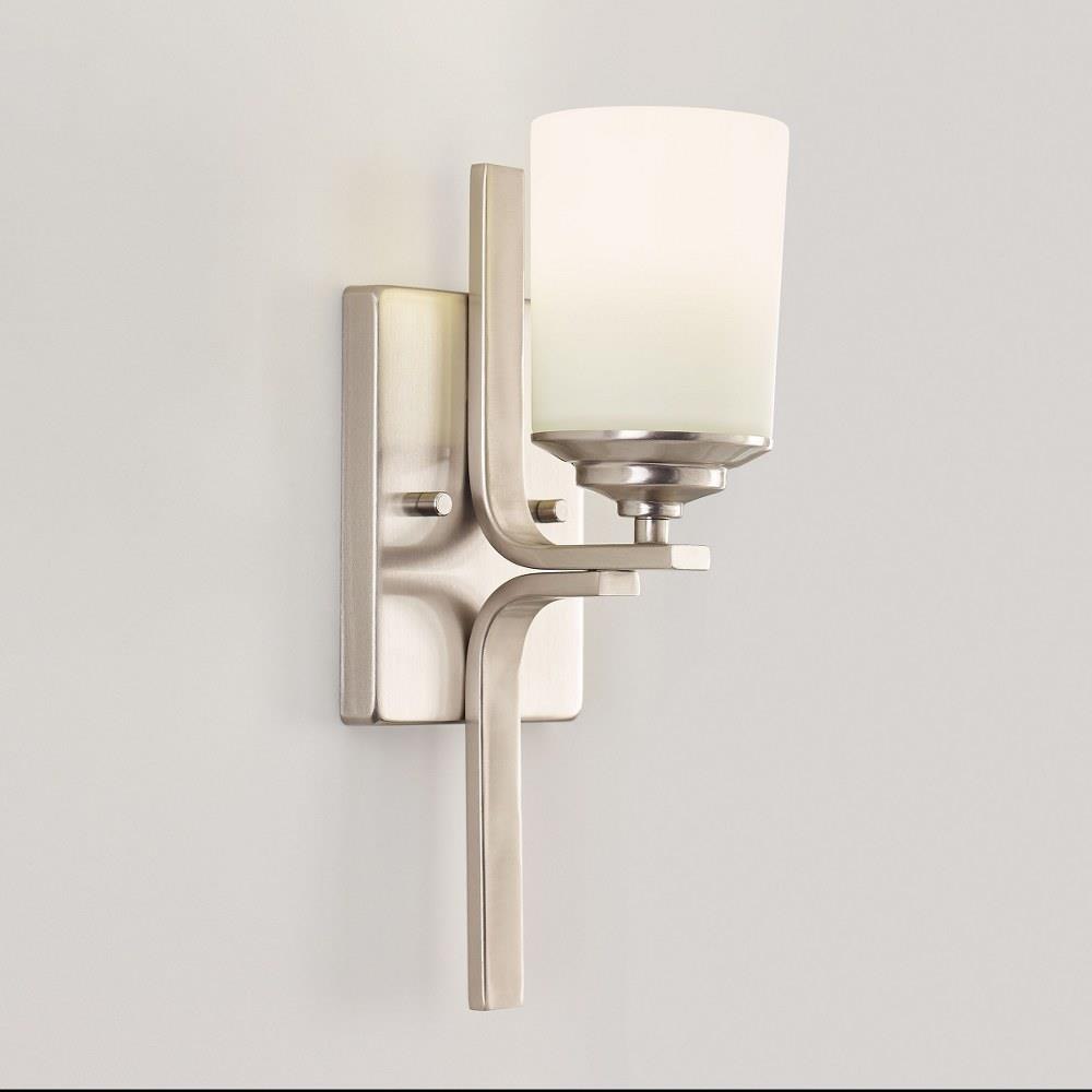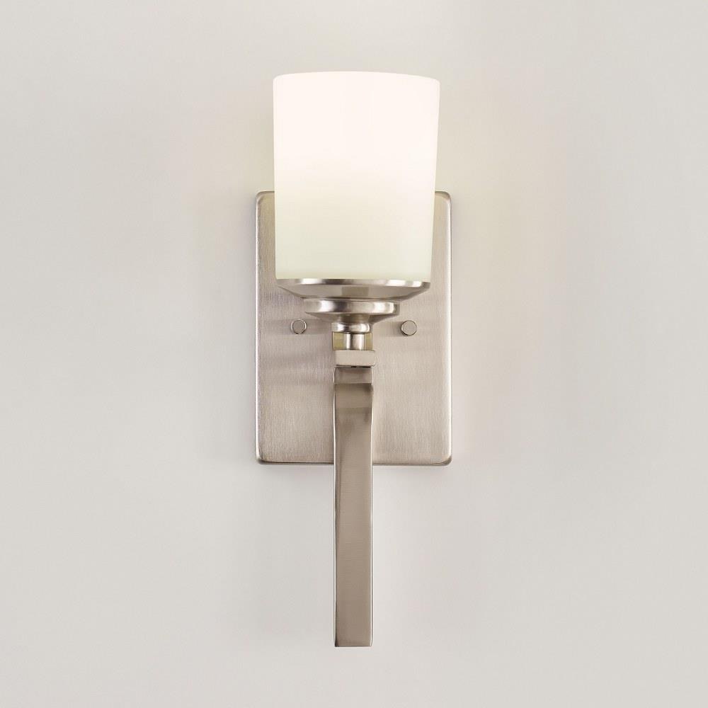 The Ellis Harper one light wall sconce in brushed nickel is an ENERGY STARĀ® qualified lighting fixture that uses LED bulbs to save you both time and money. Ellis Harper has an Arts and Crafts pedigree with a Modernist twist. The array of fixtures showcases the commitment to high style with robust construction and craftsmanship at an exceptional price. The subtle detail allows this transitional design to easily fit into any decor. The sleek, geometric arms and square Satin Etched glass shades add touches of elegance to its streamlined profile. The assortment includes: four- and eight-light chandeliers, a six-light linear, one-light mini-pendant, and one-, two-, three- and four-light bath fixtures. All fixtures are offered in either a Brushed Nickel or Brushed Oil Rubbed Bronze.Product Features and Benefits