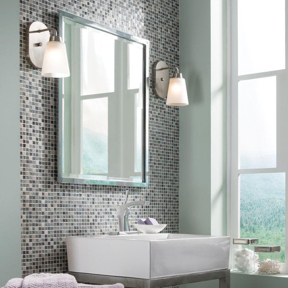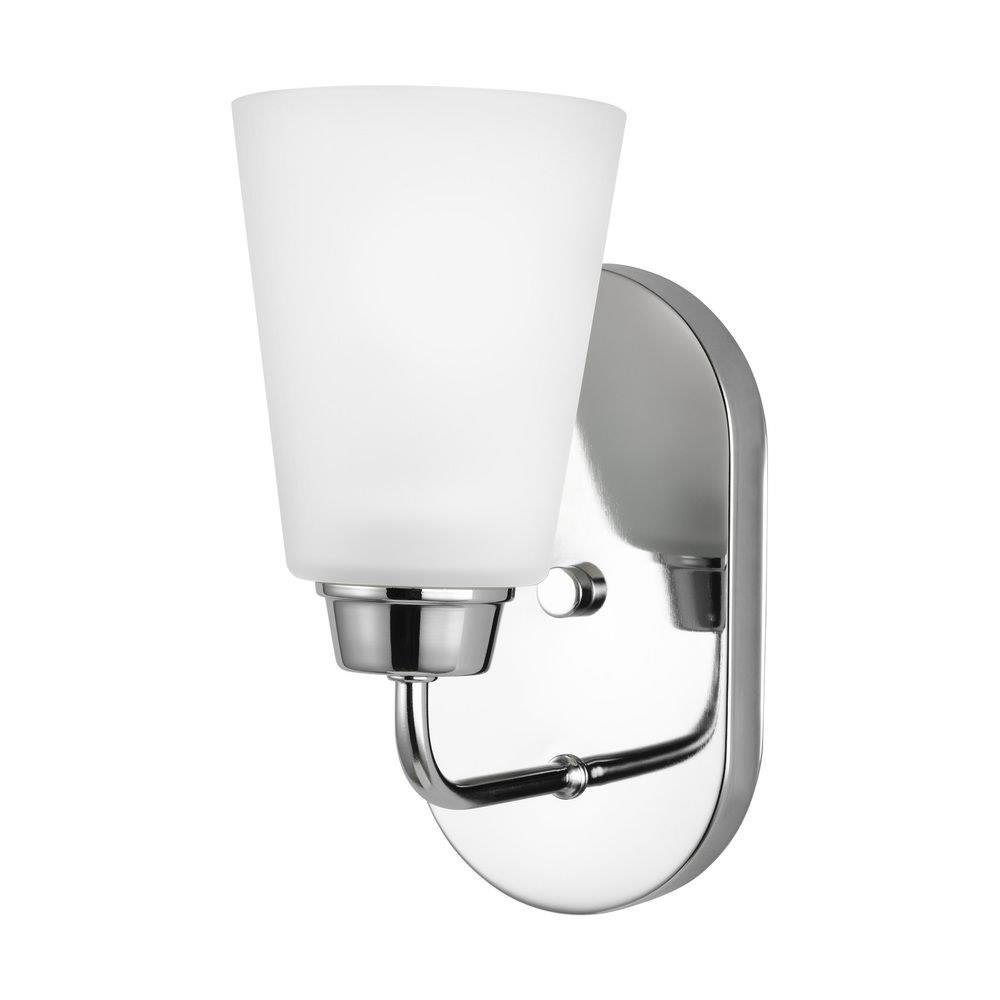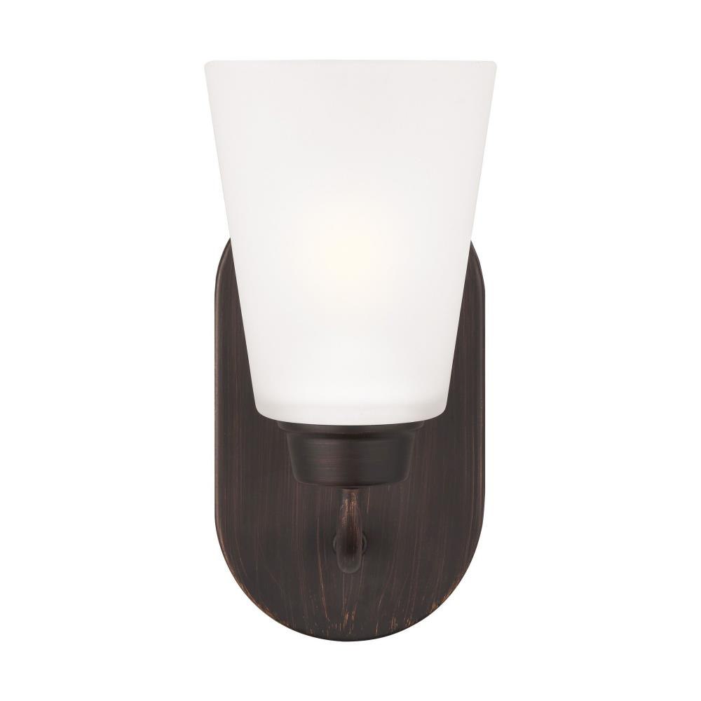 The Kerrville one light wall sconce in bronze offers shadow-free lighting in your powder room, spa, or master bath room. With a simple, airy appearance, the Kerrville lighting collection by embraces its modern design roots while enhancing virtually any homes decor. Tubular steel arms extend outward and curve to present beautiful tapered, Satin Etched glass shades. The collection has a Brushed Nickel, Burnt Sienna or Chrome finish and offers three-, five- and nine-light chandeliers, a one-light mini pendant, one- and three-light pendants, a two-light semi-flush mount which can convert to a pendant, and one-, two-, three- and four-light bath fixtures. Incandescent and ENERGY STAR-qualified LED lamping are available; all fixtures are California Title 24 compliant.Product Features and Benefits