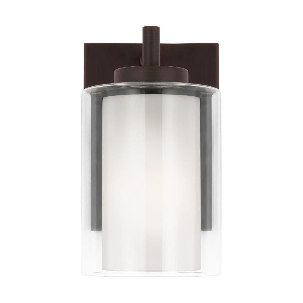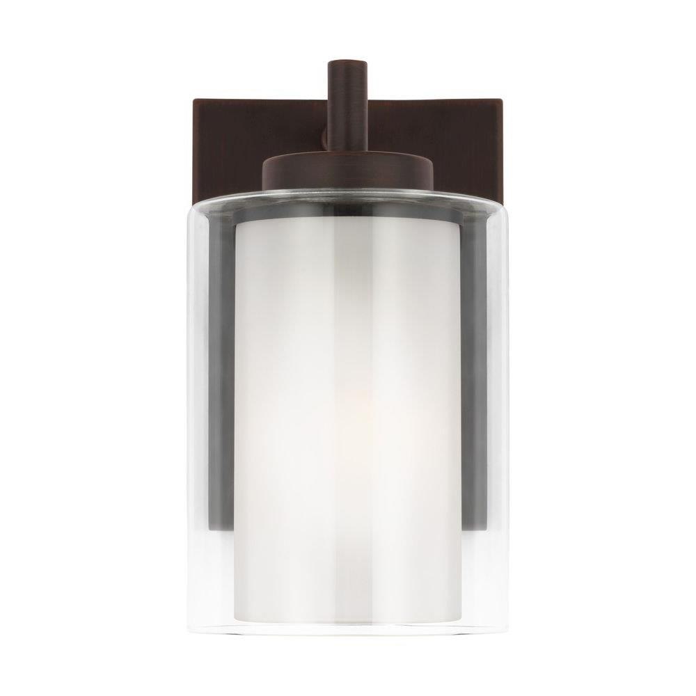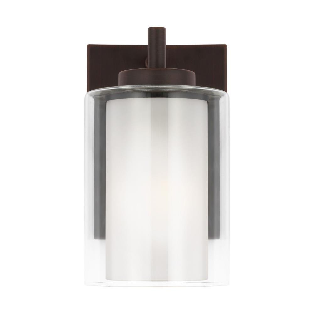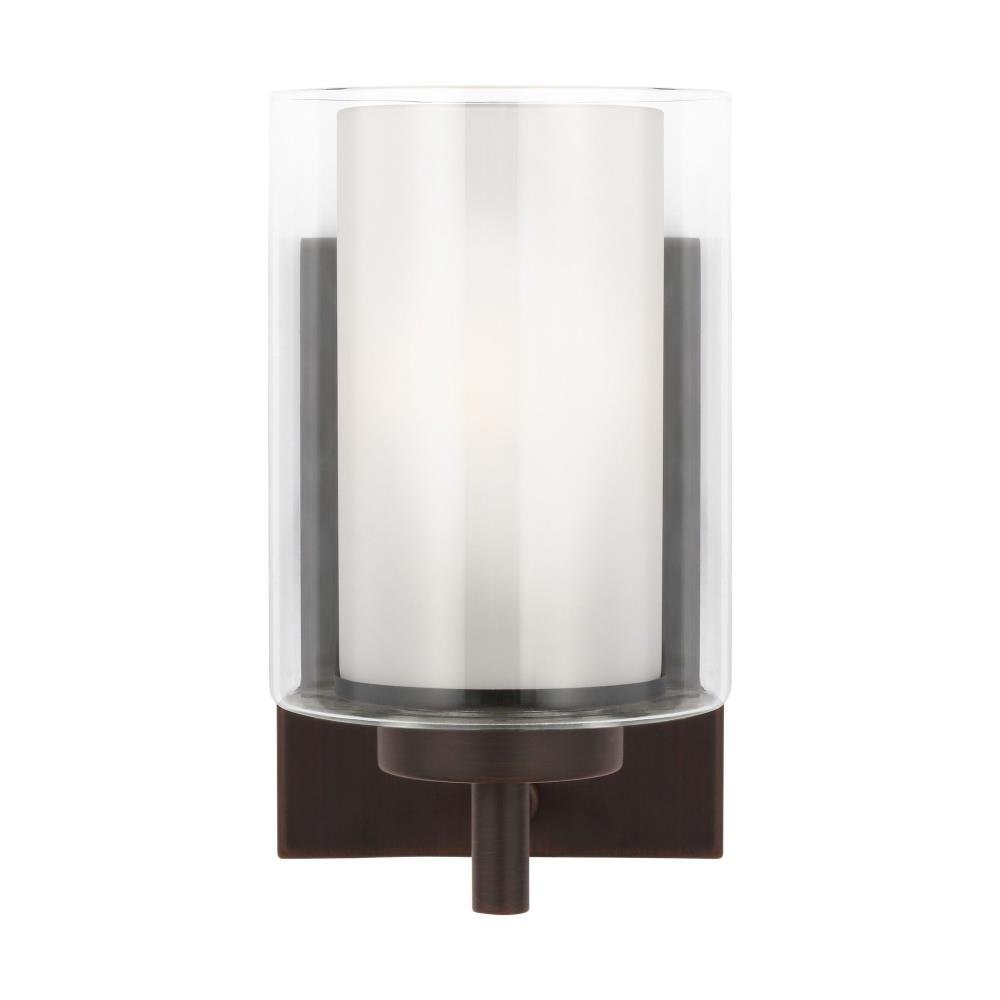 The Elmwood Park one light wall sconce in bronze offers shadow-free lighting in your powder room, spa, or master bath room. Elmwood Park by has clear glass tube shades with an inner white glass element that softens the light and helps cast an even glow. A cylinder of etched glass is centered within a larger cylinder of clear glass which encircles each light bulb to create this stunning visual effect. The full assortment includes three-, five-and nine-light chandeliers, a four-light linear, one-light mini pendant, a three-light pendant, a two-light semi flush which is convertible into a pendant, and one-, two-, three- and four-light bath fixtures. All fixtures offered in either a Brushed Nickel or Brushed Oil Rubbed Bronze. Incandescent and ENERGY STAR-qualified LED lamping are available; all fixtures are California Title 24 compliant.