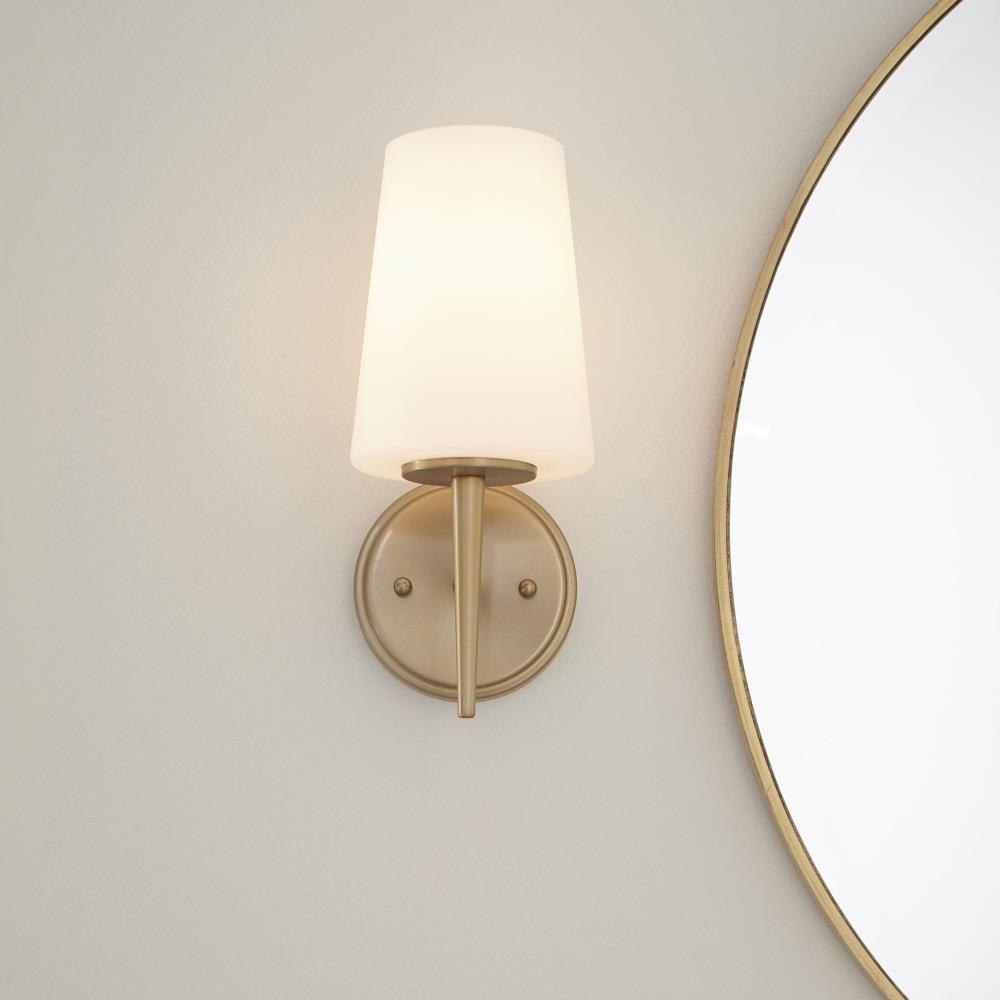 The Driscoll one light wall sconce in brushed nickel is an ENERGY STAR® qualified lighting fixture that uses LED bulbs to save you both time and money. The 1960âs-inspired Driscoll collection by features the clean lines of tapered stems and glass shades. Simplicity combined with sophistication creates this strikingly modern look. Offered in a Brushed Nickel finish in addition to the Chrome finish also offered for wall/bath fixtures all of which feature Etched White glass shades. The assortment includes nine-light, five-light and three-light chandeliers, a mini pendant, as well as one-light, two-light, three-light and four-light wall/bath fixtures. Both incandescent lamping and ENERGY STAR-qualified LED lamping are available; all fixtures are California Title 24 compliant.Product Features and Benefits
