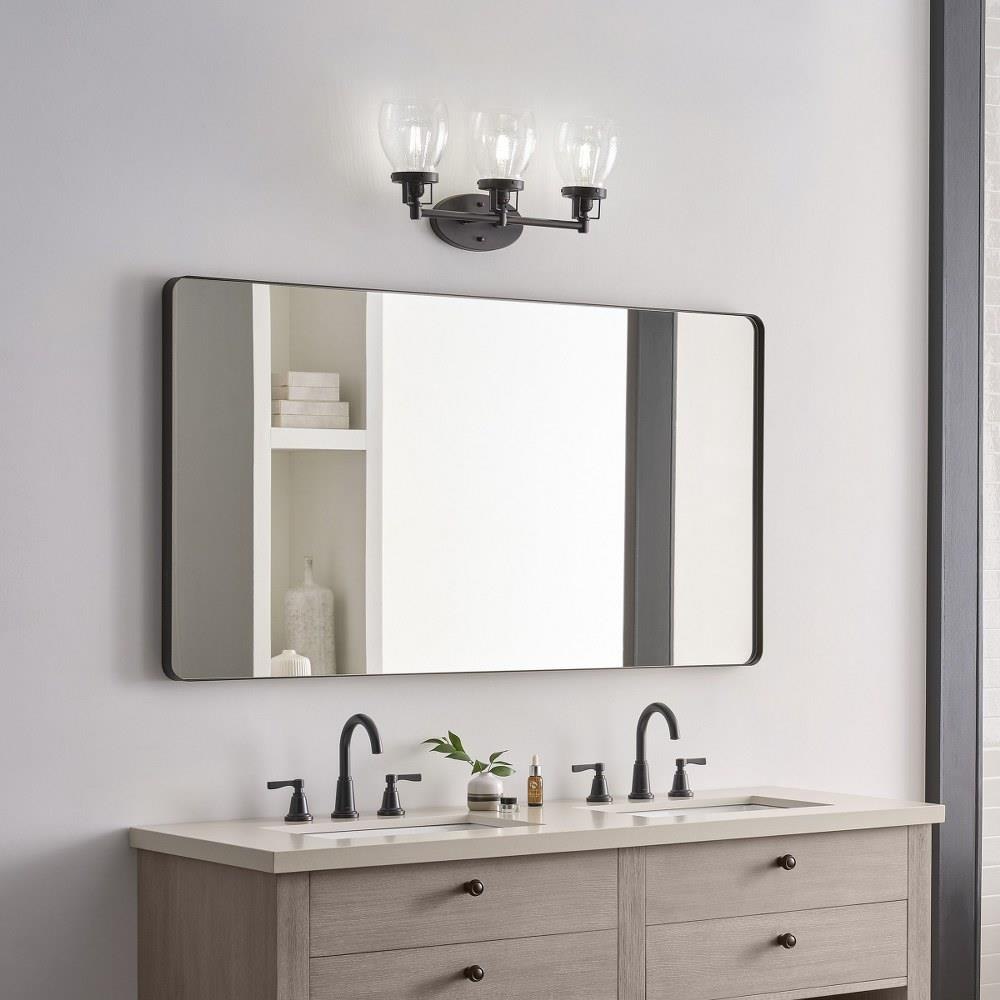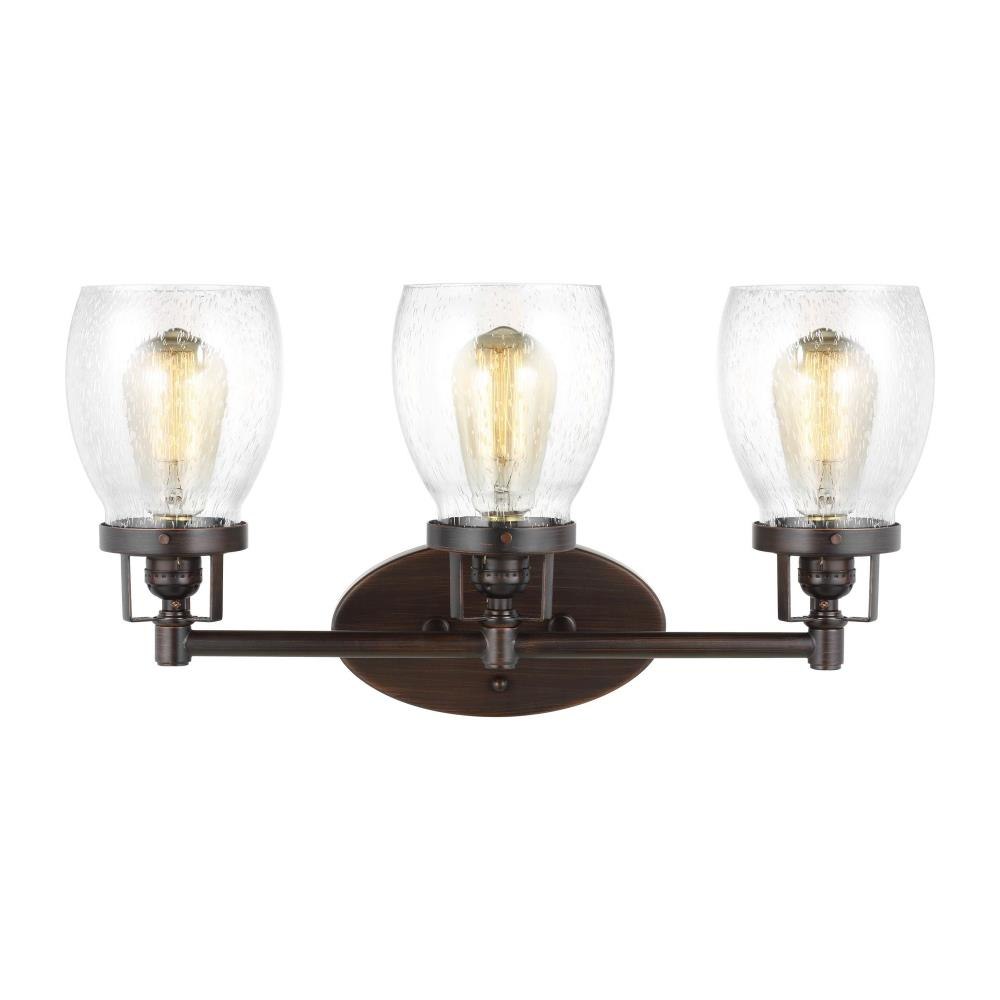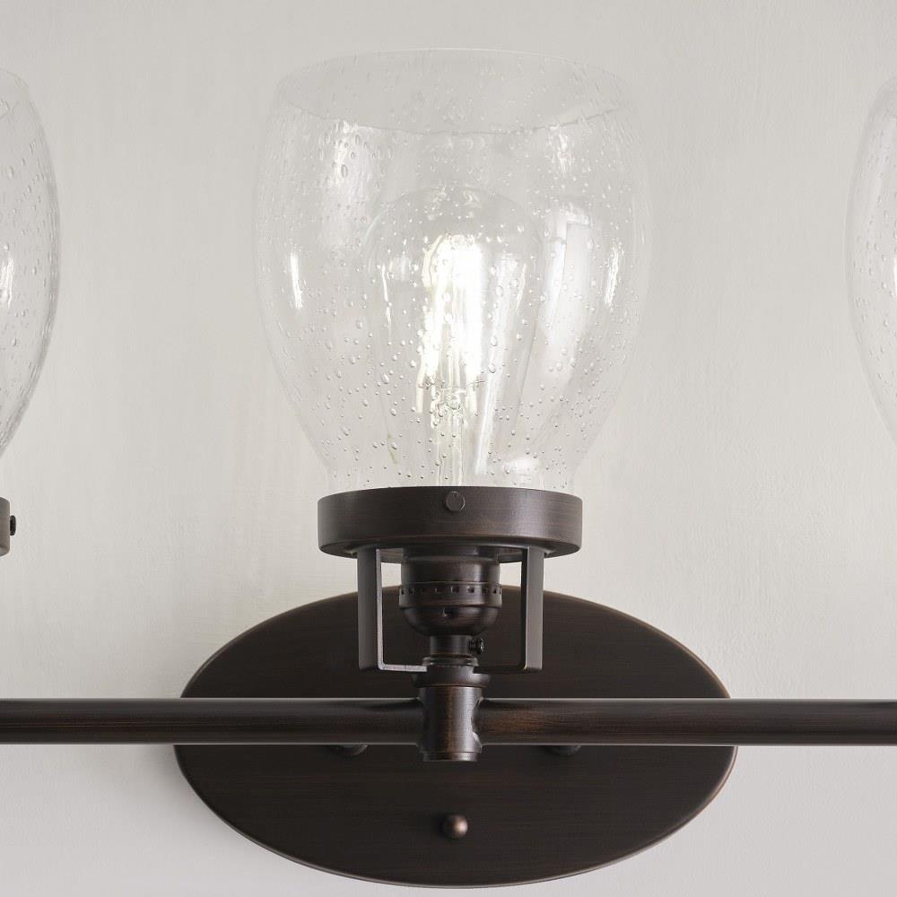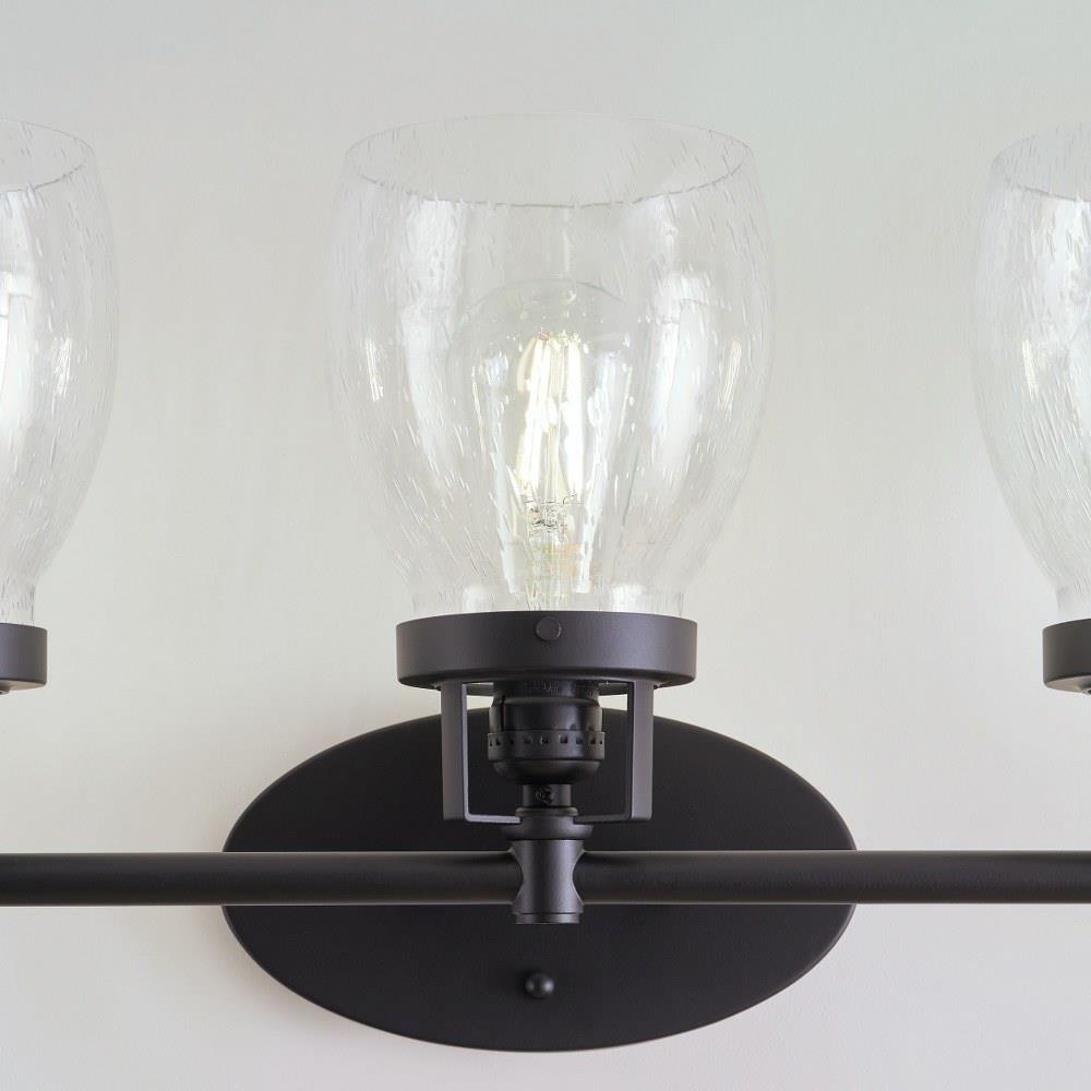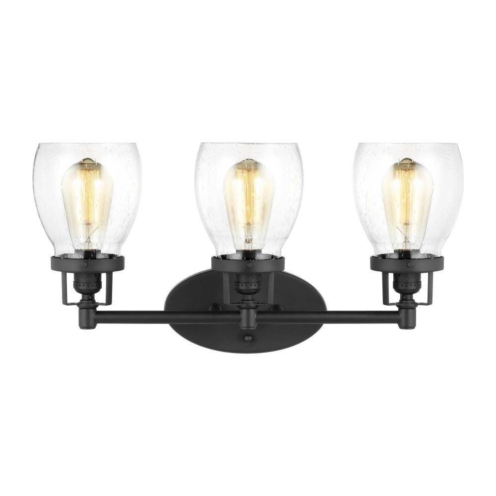 The Belton three light vanity fixture in bronze offers shadow-free lighting in your powder room, spa, or master bath room. Influenced by the vintage industrial designs of early 20th Century America, the transitional Belton lighting collection has seeded glass shades and Midnight Black finish, adding a layer of retro design to the warm look.