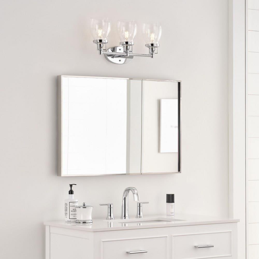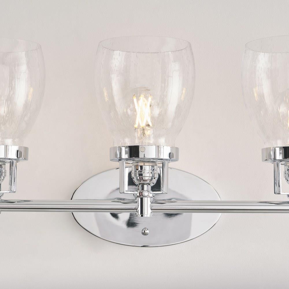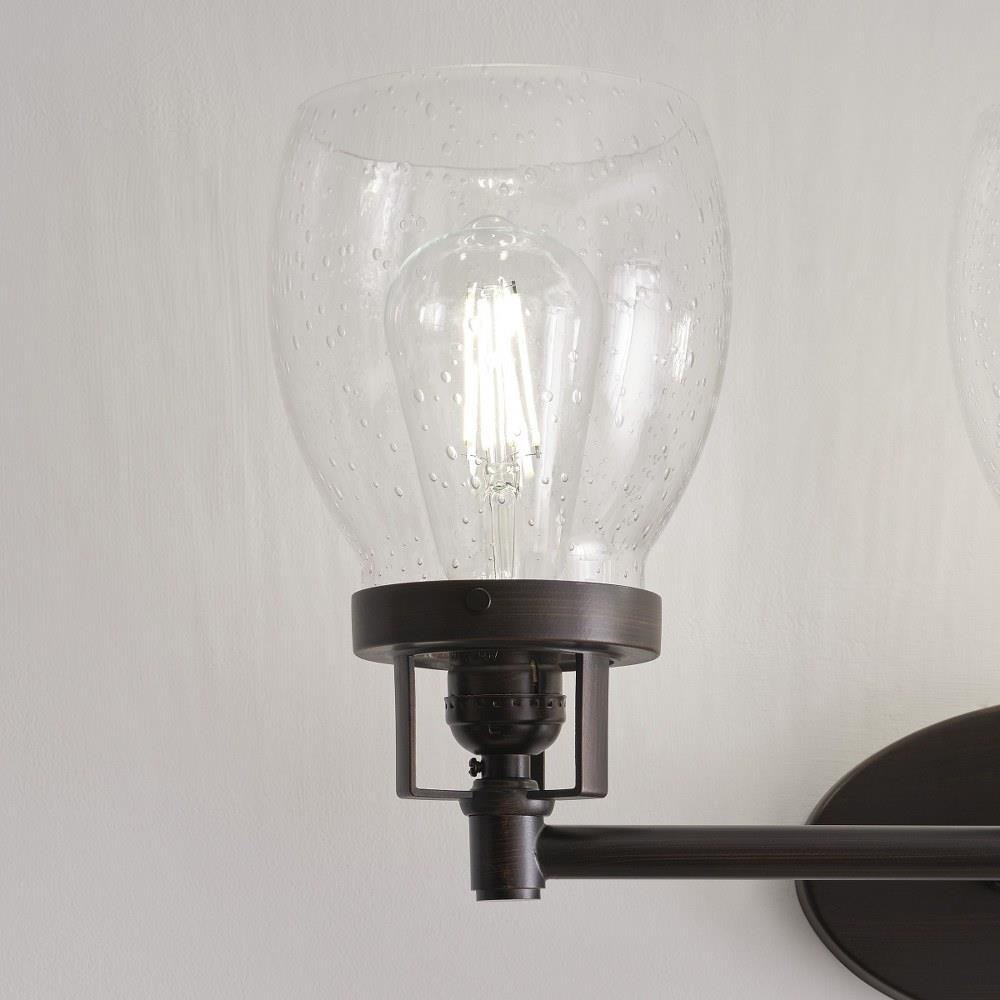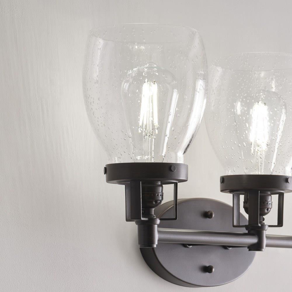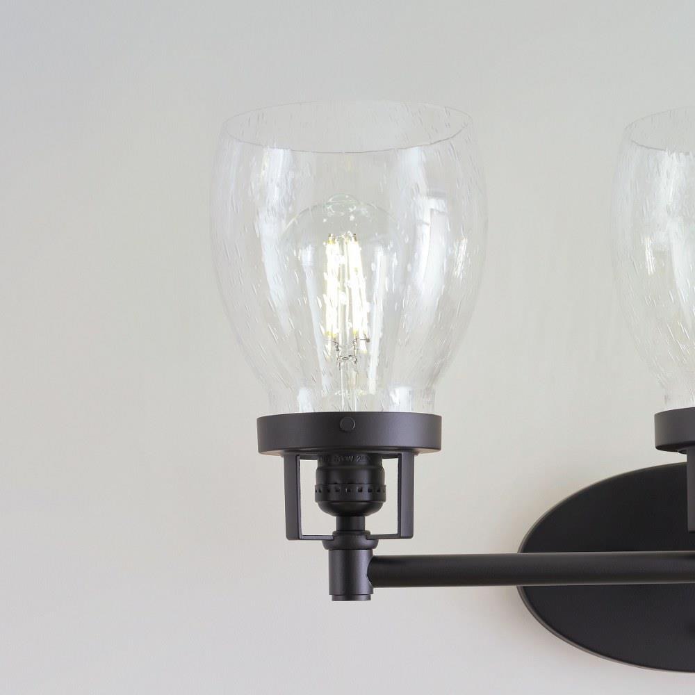 The Belton three light vanity fixture in bronze offers shadow-free lighting in your powder room, spa, or master bath room. Influenced by the vintage industrial designs of early 20th Century America, the transitional Belton lighting collection has seeded glass shades and Midnight Black finish, adding a layer of retro design to the warm look.
