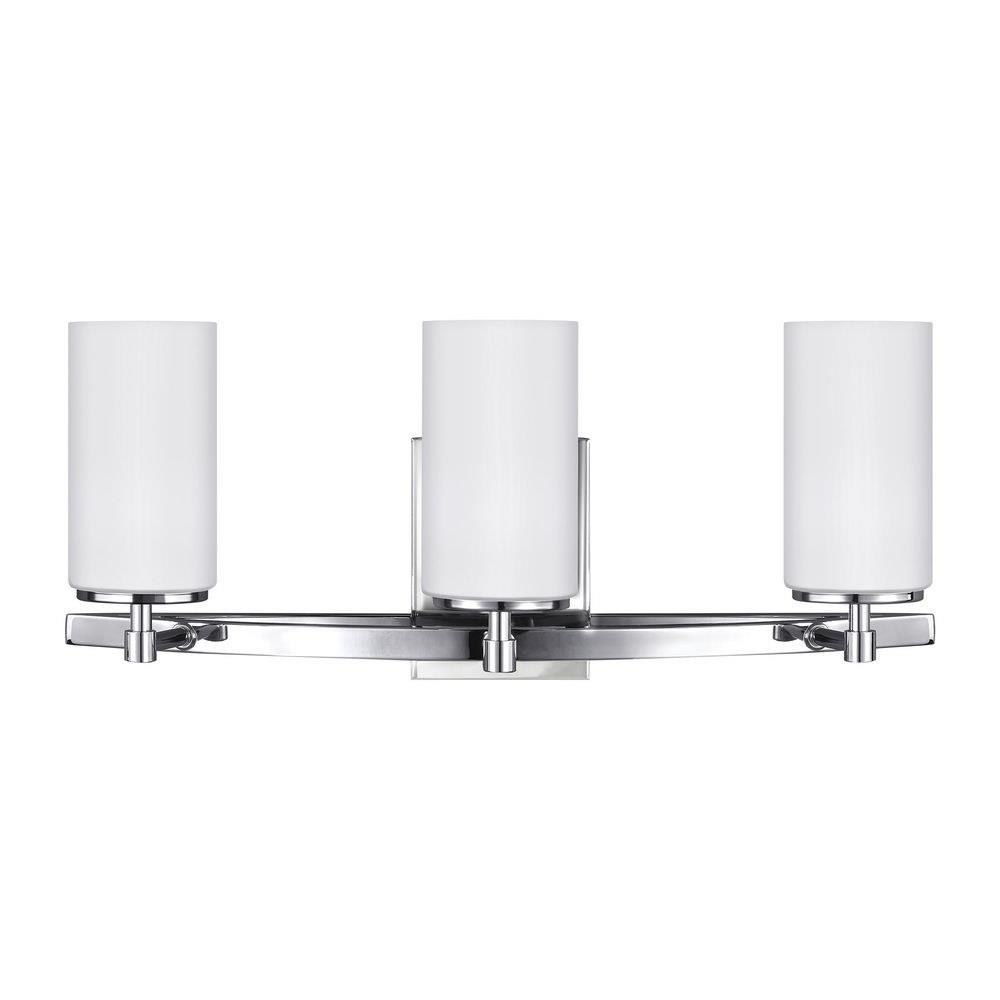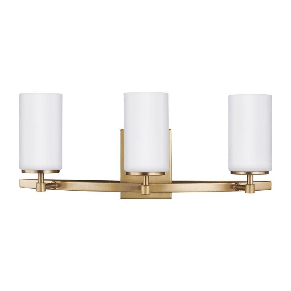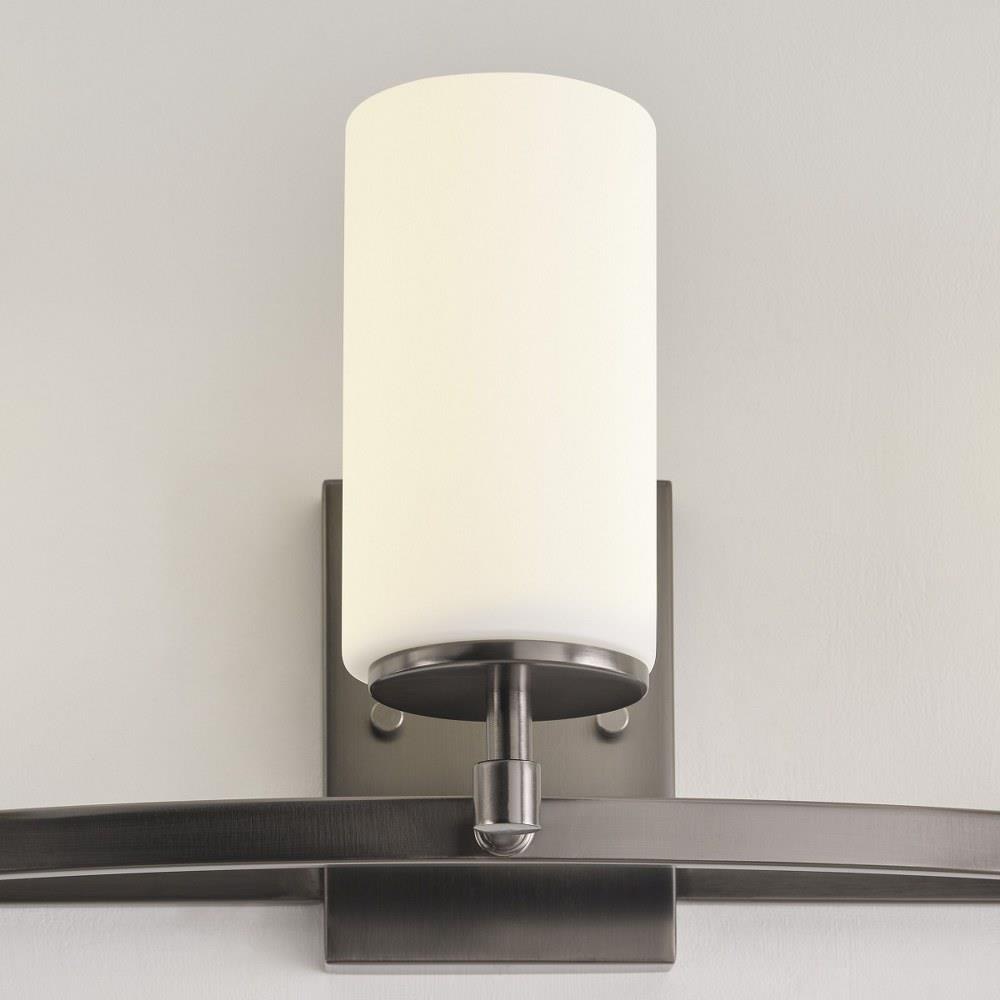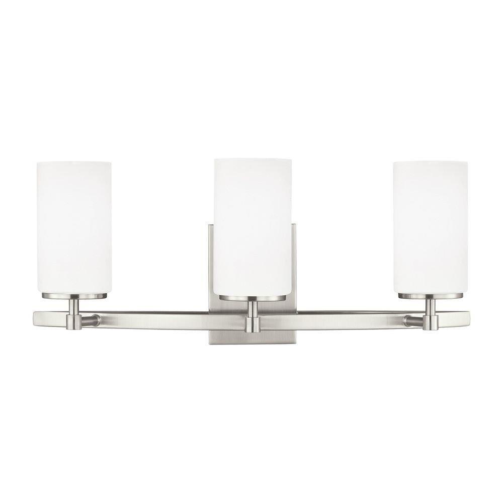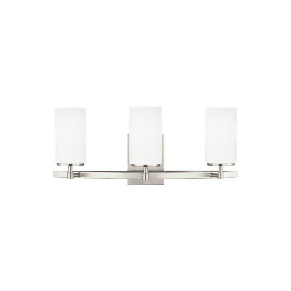 The Alturas three light vanity fixture in brushed nickel is an ENERGY STARĀ® qualified lighting fixture that uses LED bulbs to save you both time and money. The silhouette of the modern Alturas lighting collection by features an interlocking, spherical steel frame, which harkens back to the Unisphere constructed for the 1964 New York World's Fair. The minimalist Alturas Collection draws the eye to the soft, warm glow of the light emitted from the cylindrical Satin Etched glass shades. The full assortment includes three-, five- and nine-light chandeliers, a one-light mini pendant, a three-light pendant, a two-light semi flush which is convertible into a pendant, and one-, two-, three- and four-light bath fixtures. All fixtures are offered in Brushed Oil Rubbed Bronze, Brushed Nickel and Satin Bronze finishes, the bath fixtures are also offered in Chrome finish. Incandescent and ENERGY STAR-qualified LED lamping are available; all fixtures are California Title 24 compliant.Product Features and Benefits