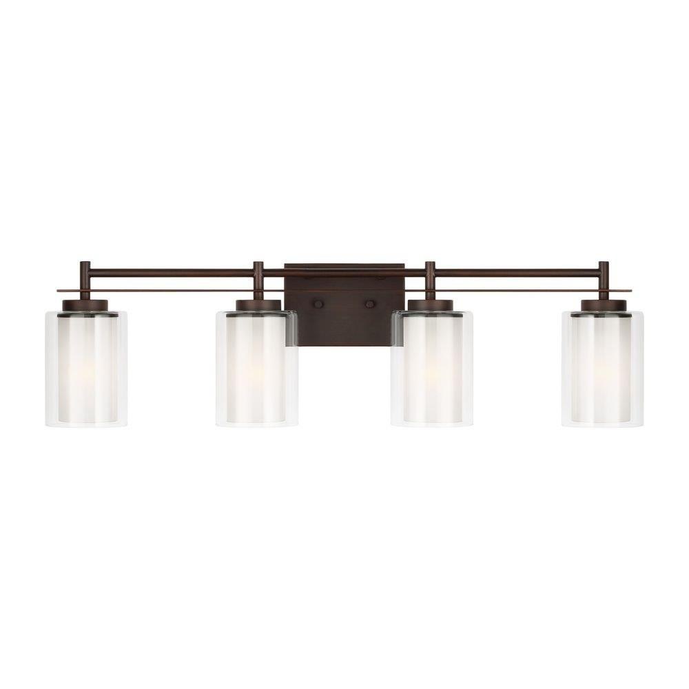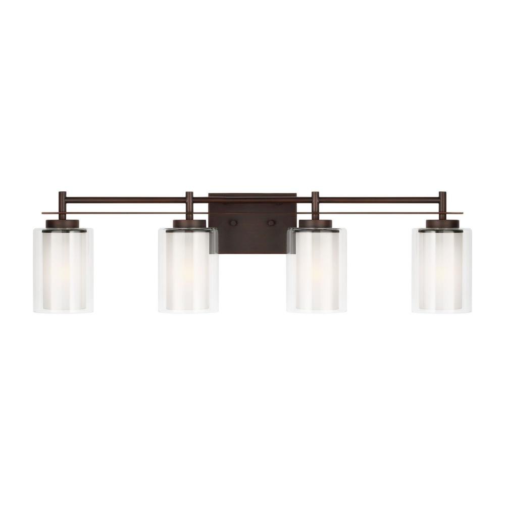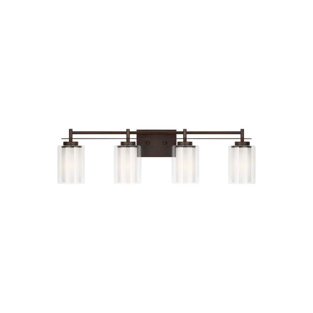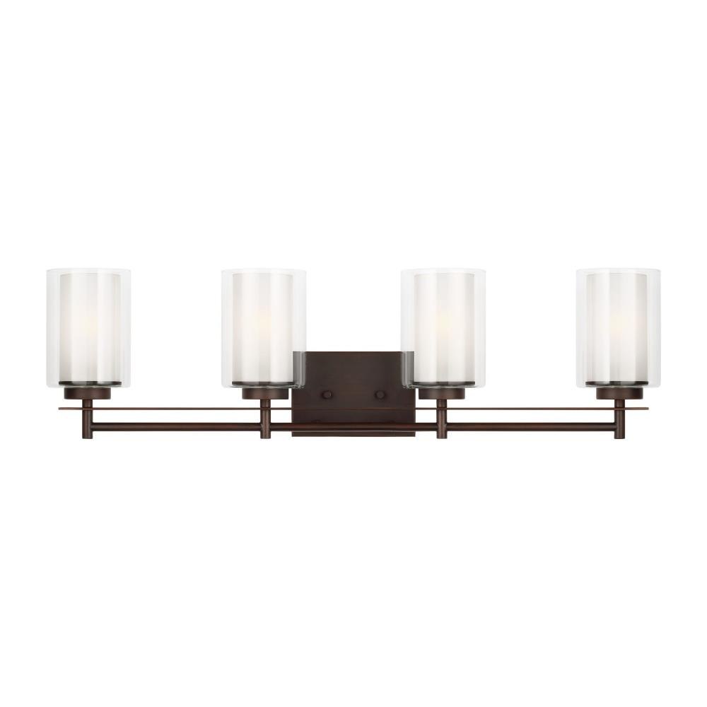 The Elmwood Park four light vanity fixture in bronze offers shadow-free lighting in your powder room, spa, or master bath room. Elmwood Park by has clear glass tube shades with an inner white glass element that softens the light and helps cast an even glow. A cylinder of etched glass is centered within a larger cylinder of clear glass which encircles each light bulb to create this stunning visual effect. The full assortment includes three-, five-and nine-light chandeliers, a four-light linear, one-light mini pendant, a three-light pendant, a two-light semi flush which is convertible into a pendant, and one-, two-, three- and four-light bath fixtures. All fixtures offered in either a Brushed Nickel or Brushed Oil Rubbed Bronze. Incandescent and ENERGY STAR-qualified LED lamping are available; all fixtures are California Title 24 compliant.Product Features and Benefits