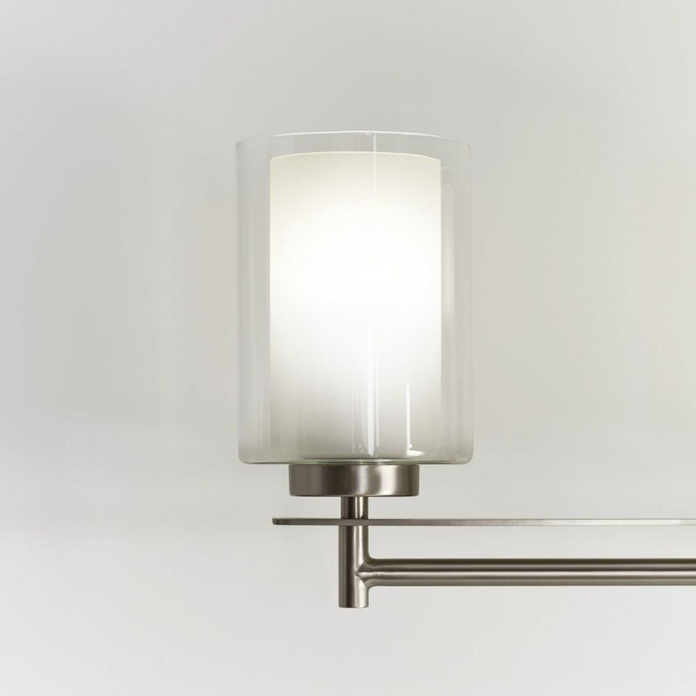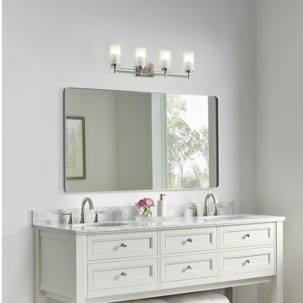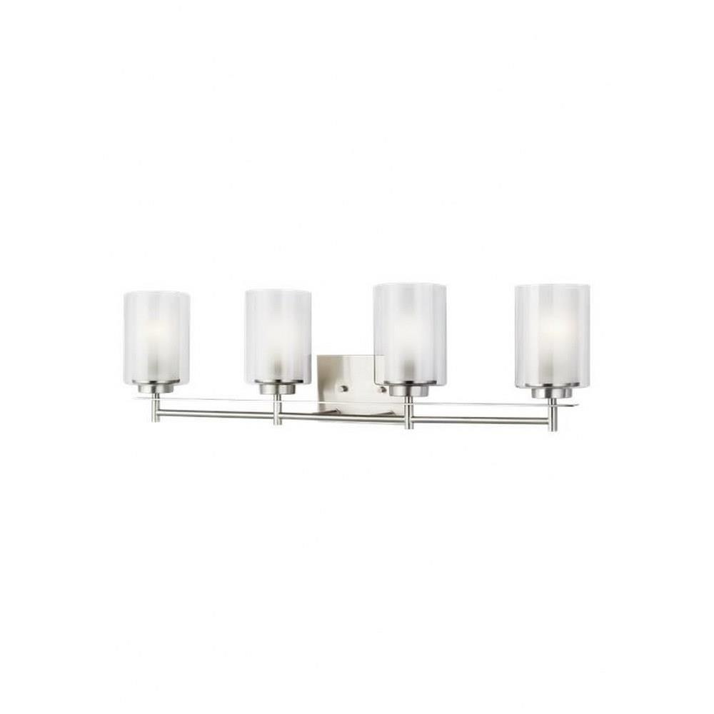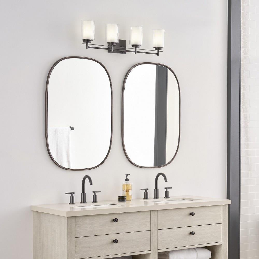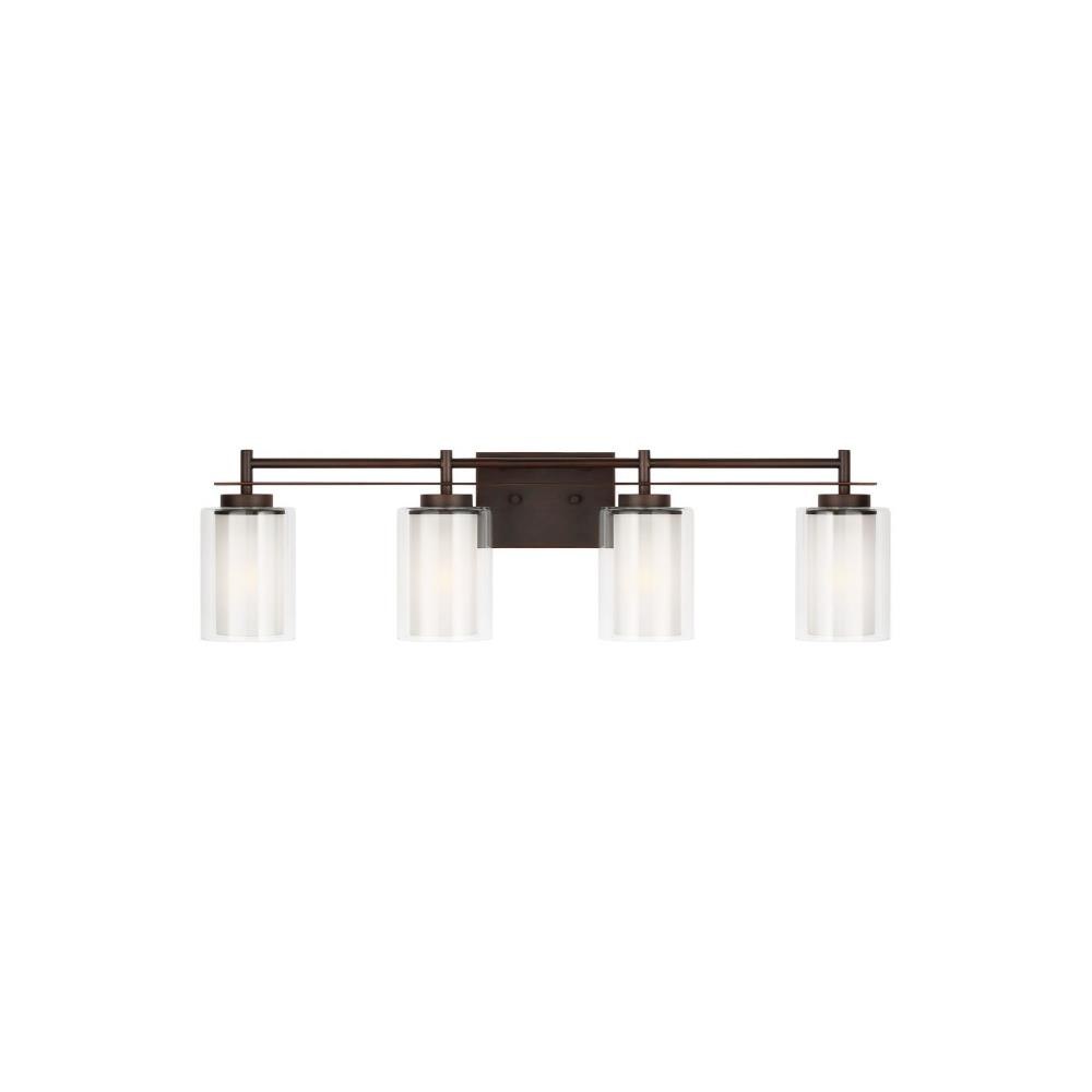 The Elmwood Park four light vanity fixture in bronze offers shadow-free lighting in your powder room, spa, or master bath room. Elmwood Park by has clear glass tube shades with an inner white glass element that softens the light and helps cast an even glow. A cylinder of etched glass is centered within a larger cylinder of clear glass which encircles each light bulb to create this stunning visual effect. The full assortment includes three-, five-and nine-light chandeliers, a four-light linear, one-light mini pendant, a three-light pendant, a two-light semi flush which is convertible into a pendant, and one-, two-, three- and four-light bath fixtures. All fixtures offered in either a Brushed Nickel or Brushed Oil Rubbed Bronze. Incandescent and ENERGY STAR-qualified LED lamping are available; all fixtures are California Title 24 compliant.Product Features and Benefits