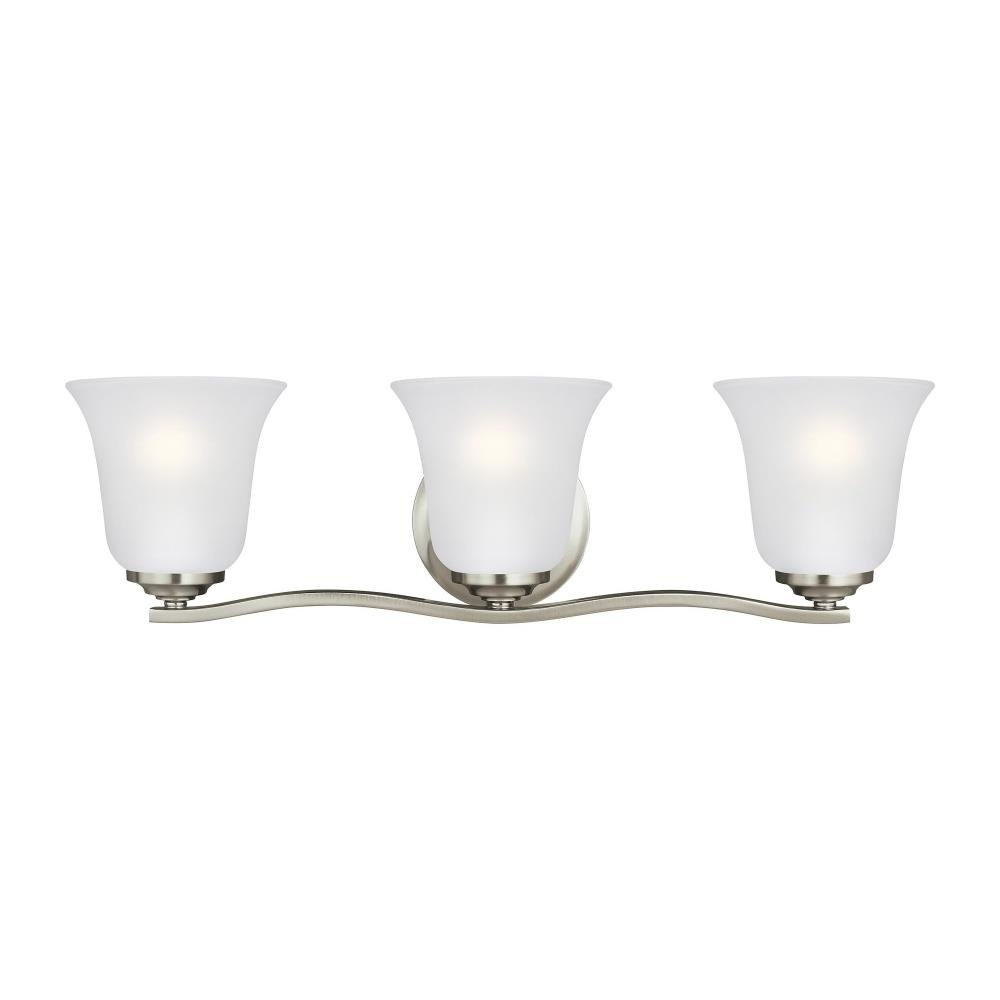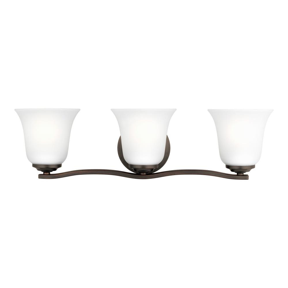 The Emmons three light vanity fixture in bronze offers shadow-free lighting in your powder room, spa, or master bath room. The Emmons lighting collection by combines form and function in a traditional empire silhouette. Trumpeted Satin Etched glass shades and a circular finial further enhance the design. Cluster three sizes together in a multi-fixture installation to make a beautifully dramatic statement in the living room, foyer, entryway or family room. The Emmons collection comes in two finishes: Brushed Nickel and Heirloom Bronze. Its assortment includes three-, five- and nine-light chandeliers; one-light mini pendant, three-light pendant, two-light semi-flush mount; one-light wall sconce; and two-, three- and four- light bath vanity fixtures. Incandescent and ENERGY STAR-qualified LED lamping are available; all fixtures are California Title 24 compliant.Product Features and Benefits