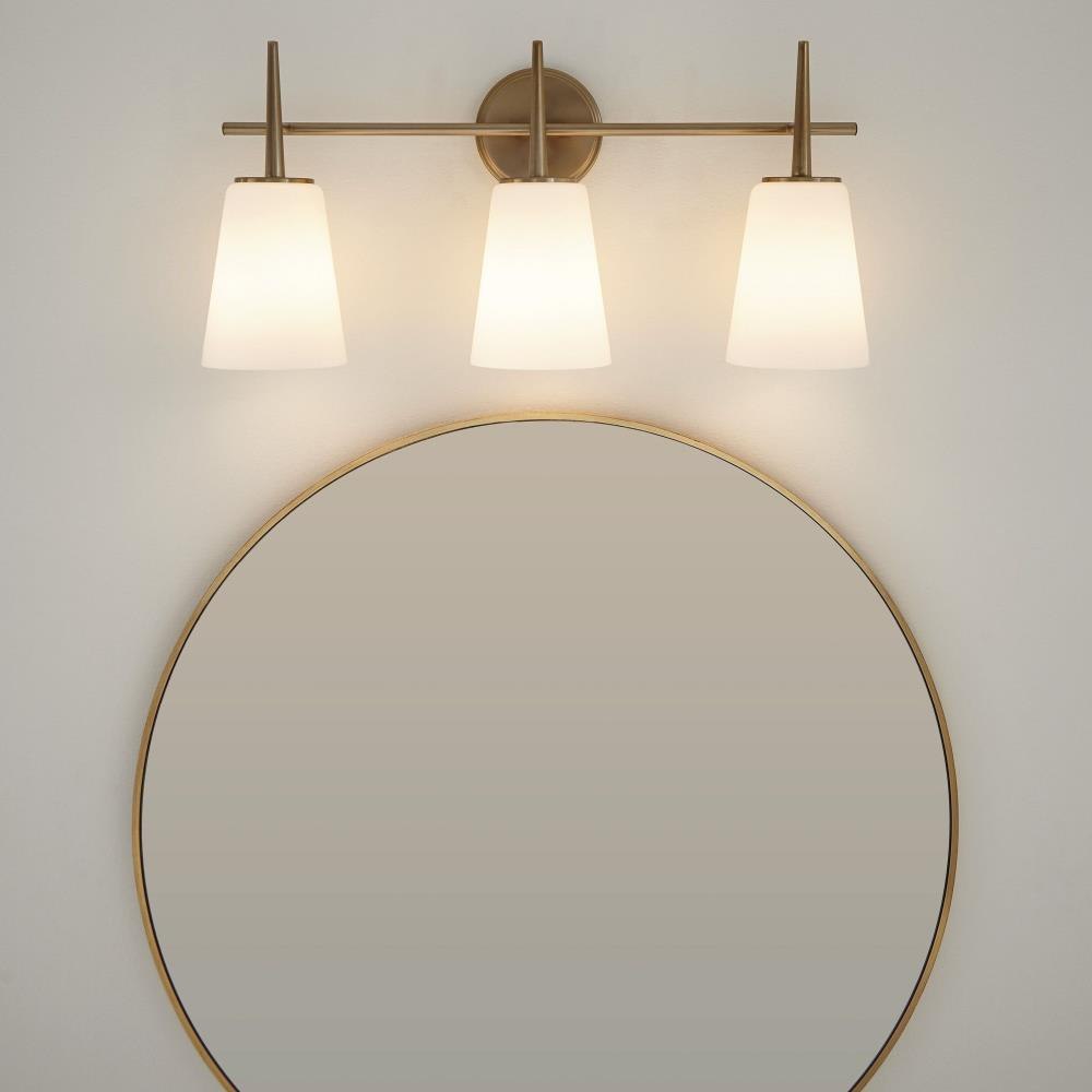 The Driscoll three light vanity fixture in brushed nickel is an ENERGY STAR® qualified lighting fixture that uses LED bulbs to save you both time and money. The 1960âs-inspired Driscoll collection by features the clean lines of tapered stems and glass shades. Simplicity combined with sophistication creates this strikingly modern look. Offered in a Brushed Nickel finish in addition to the Chrome finish also offered for wall/bath fixtures all of which feature Etched White glass shades. The assortment includes nine-light, five-light and three-light chandeliers, a mini pendant, as well as one-light, two-light, three-light and four-light wall/bath fixtures. Both incandescent lamping and ENERGY STAR-qualified LED lamping are available; all fixtures are California Title 24 compliant.Product Features and Benefits