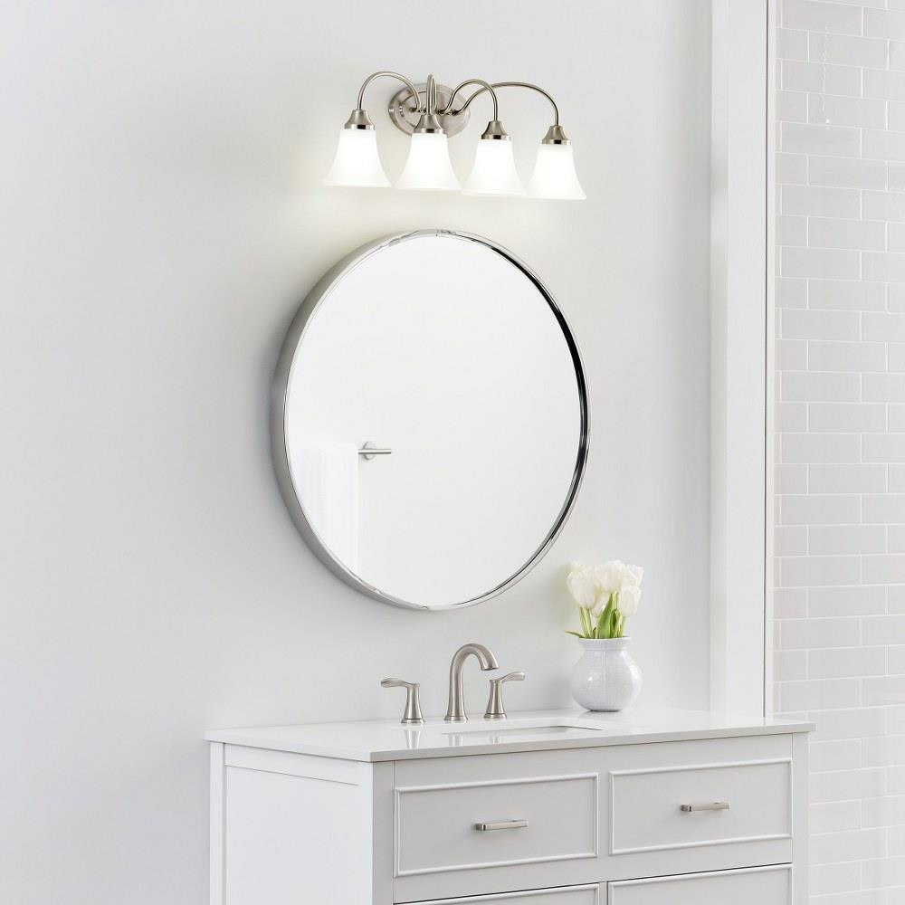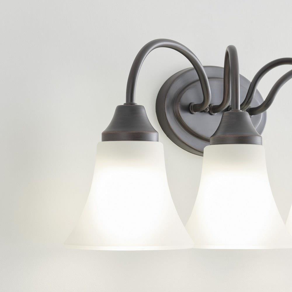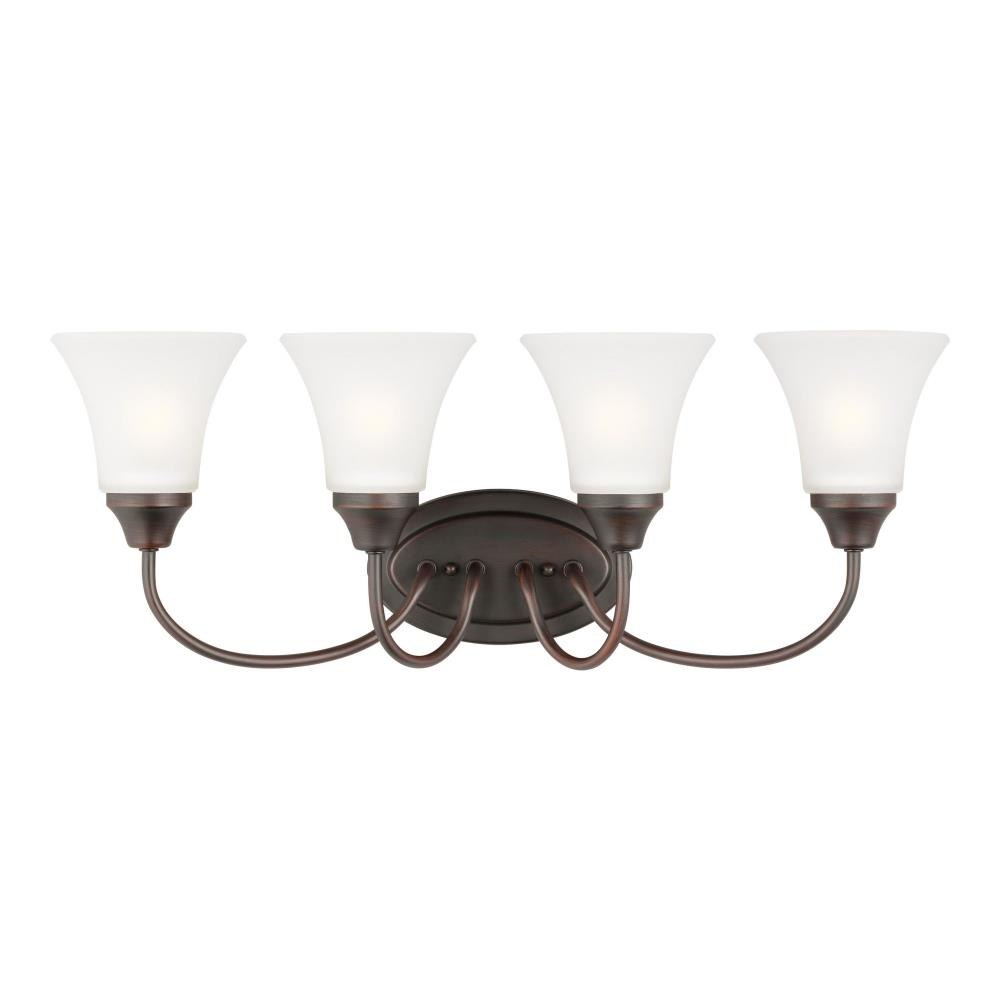 The Holman four light vanity fixture in bronze provides abundant light for your bath vanity, while adding a layer of today's style to your interior design. Holman features softly flared glass and curved arms, with just enough detail to give the overall look a lift while keeping it simple enough for those on a budgetProduct Features and Benefits