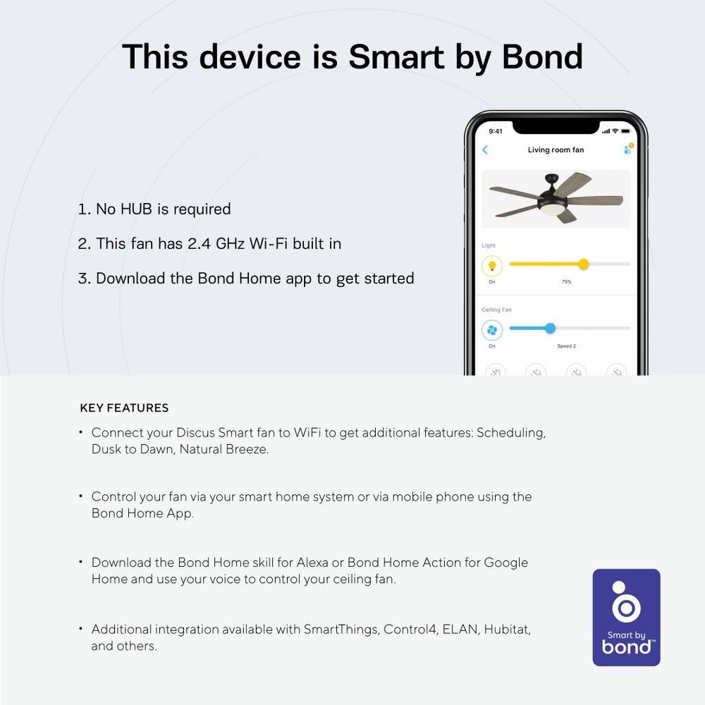 The Discus Smart 52 in Aged Pewter features a 150.0 X 16.0 6 speed motor with a Twelve degree blade pitch. With a minimalist, contemporary design and four finish options, the Discus 52 fan has always been versatile. Now, the new Discus Smart connects locally to Wi-Fi, allowing you full voice control via Alexa, Google Home or Siri and the ability to operate the fan while away via your mobile device. Control your fan via your smart home system or via mobile phone using the Bond Home App. Download the Bond Home skill for Alexa or Bond Home Action for Google Home and use your voice to control your ceiling fan.Product Features and Benefits