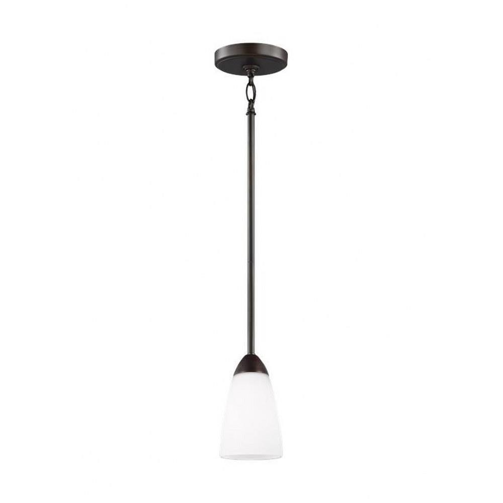 The Seville one light mini pendant in bronze enhances the beauty of your home with ample light and style to match today's trends. The Seville collection represents commitment to high style at a sharp price. The modernist design is epitomized by the teardrop curves in the arms tipped by Etched glass diffusors throughout the chandeliers and bath fixtures. The collection offers a "whole home" lighting solution in every imaginable category. The assortment includes nine-light, five-light, and three-light chandeliers (either with up-light or down-light), pendants in four sizes as well as one-light, two-light, three-light , four-light and five-light wall/bath fixtures. Install a stylish and elegant addition to any room in the house. Seville is offered in Brushed Nickel and Burnt Sienna finishes.Product Features and Benefits