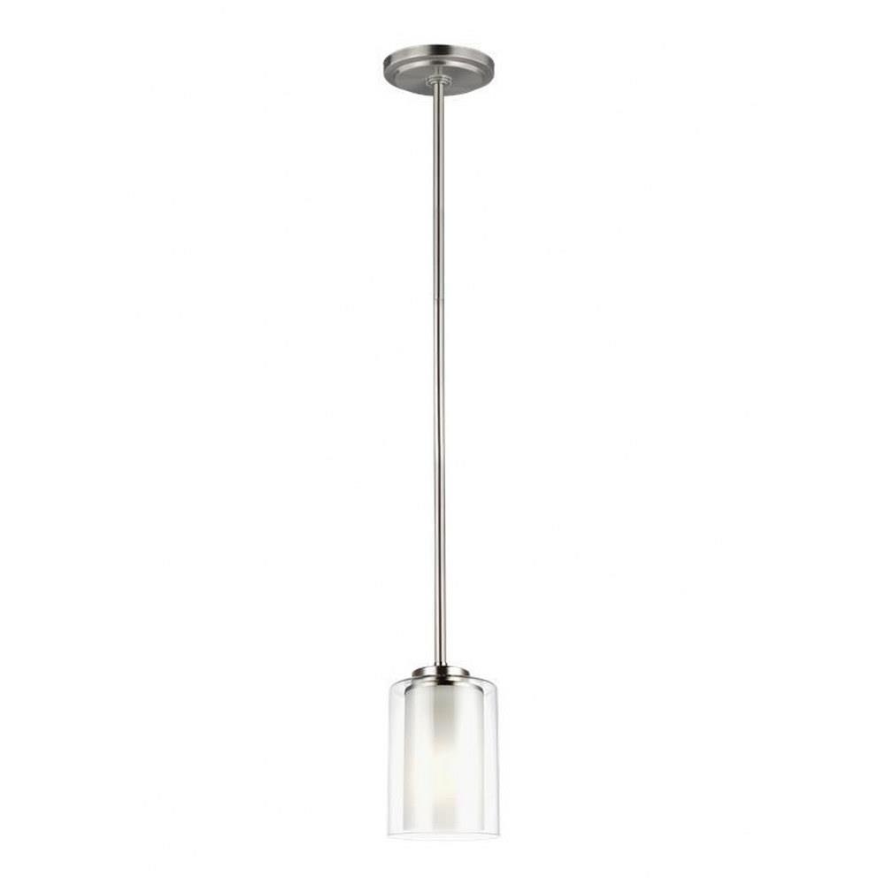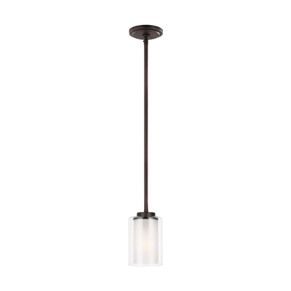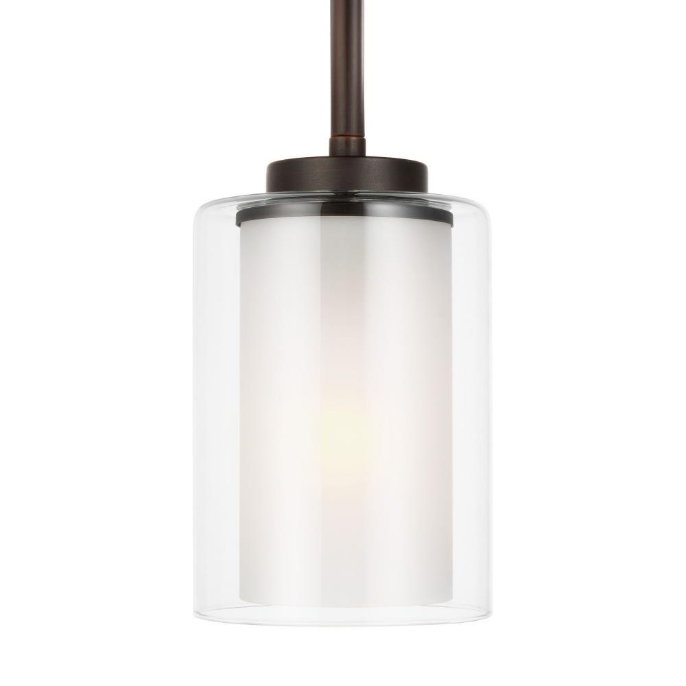 The Elmwood Park one light mini pendant in bronze provides abundant light to your home, while adding style and interest. Elmwood Park by has clear glass tube shades with an inner white glass element that softens the light and helps cast an even glow. A cylinder of etched glass is centered within a larger cylinder of clear glass which encircles each light bulb to create this stunning visual effect. The full assortment includes three-, five-and nine-light chandeliers, a four-light linear, one-light mini pendant, a three-light pendant, a two-light semi flush which is convertible into a pendant, and one-, two-, three- and four-light bath fixtures. All fixtures offered in either a Brushed Nickel or Brushed Oil Rubbed Bronze. Incandescent and ENERGY STAR-qualified LED lamping are available; all fixtures are California Title 24 compliant.Product Features and Benefits