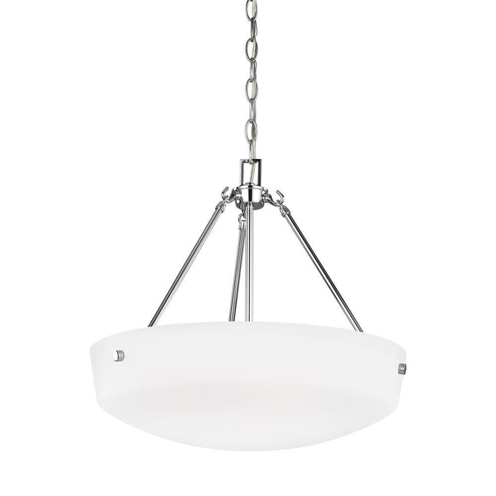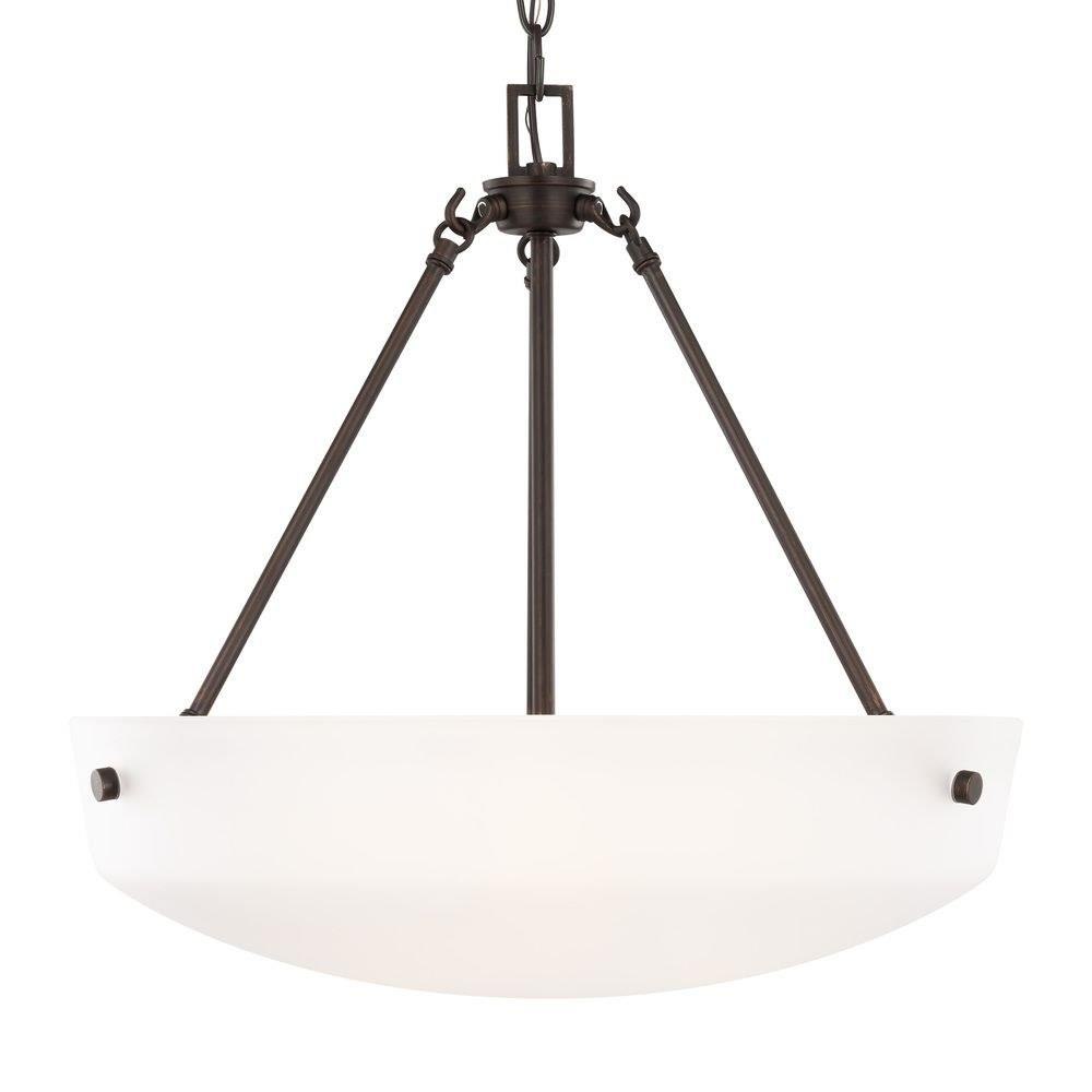 The Kerrville three light indoor pendant in bronze enhances the beauty of your home with ample light and style to match today's trends. With a simple, airy appearance, the Kerrville lighting collection by embraces its modern design roots while enhancing virtually any homes decor. Tubular steel arms extend outward and curve to present beautiful tapered, Satin Etched glass shades. The collection has a Brushed Nickel, Burnt Sienna or Chrome finish and offers three-, five- and nine-light chandeliers, a one-light mini pendant, one- and three-light pendants, a two-light semi-flush mount which can convert to a pendant, and one-, two-, three- and four-light bath fixtures. Incandescent and ENERGY STAR-qualified LED lamping are available; all fixtures are California Title 24 compliant.Product Features and Benefits