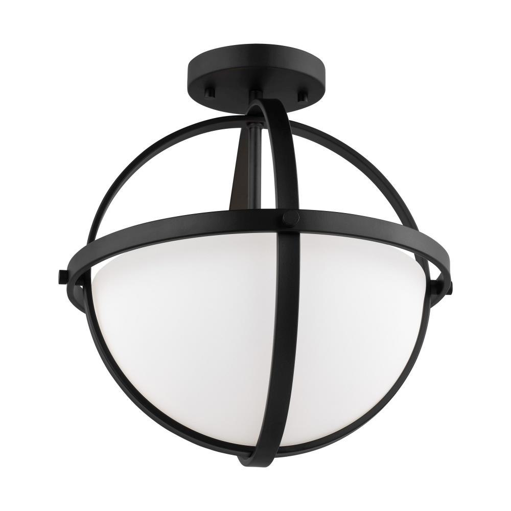 The Alturas two light indoor semi-flush convertible in Midnight Black is the perfect way to achieve your desired fashion or functional needs in your home. The silhouette of the modern Alturas lighting collection by features an interlocking, spherical steel frame, which harkens back to the Unisphere constructed for the 1964 New York World's Fair. The minimalist Alturas Collection draws the eye to the soft, warm glow of the light emitted from the cylindrical Satin Etched glass shades. The full assortment includes three-, five- and nine-light chandeliers, a one-light mini pendant, a three-light pendant, a two-light semi flush which is convertible into a pendant, and one-, two-, three- and four-light bath fixtures. All fixtures are offered in Brushed Oil Rubbed Bronze, Brushed Nickel, Midnight Black and Satin Brass finishes, the bath fixtures are also offered in Chrome finish. Incandescent and ENERGY STAR-qualified LED lamping are available; all fixtures are California Title 24 compliant.Product Features and Benefits