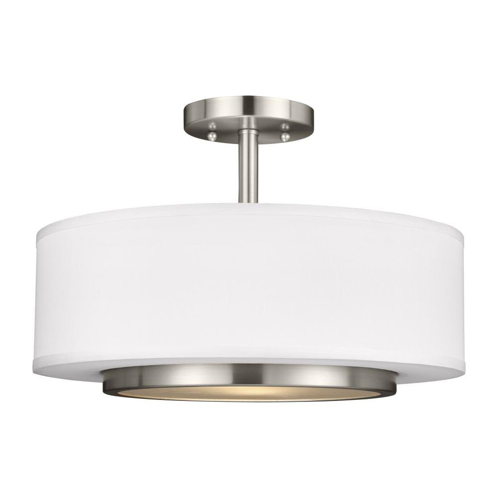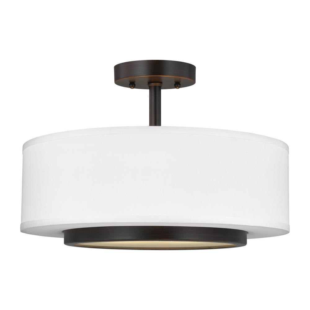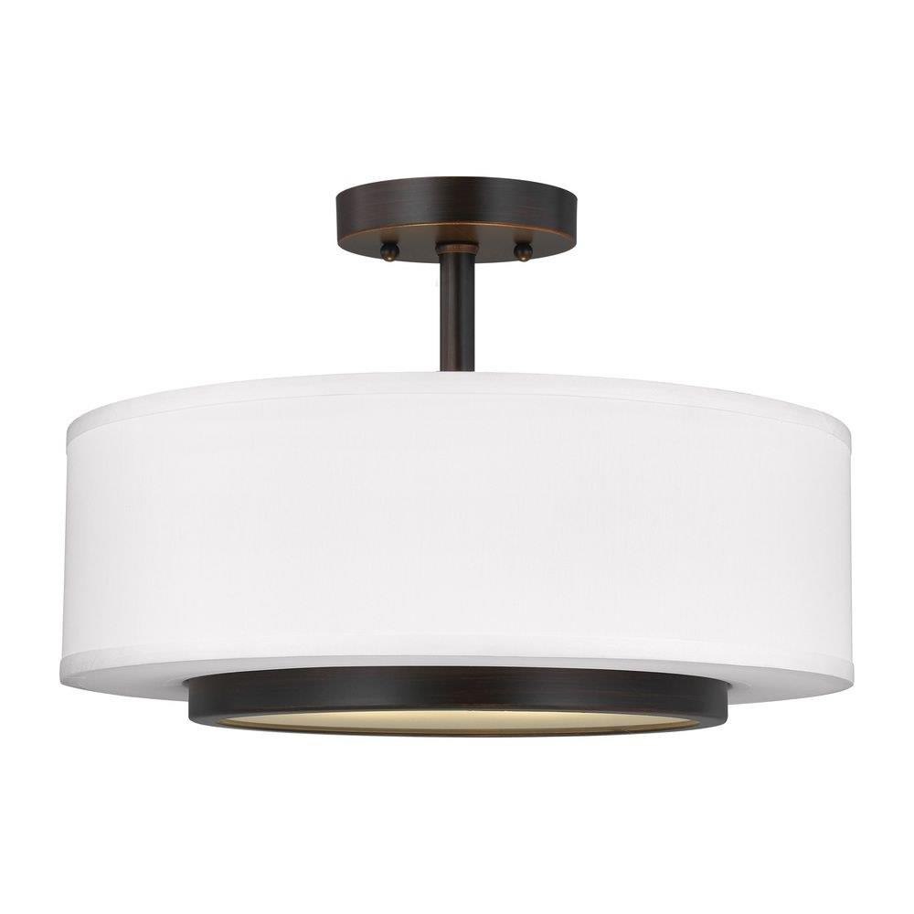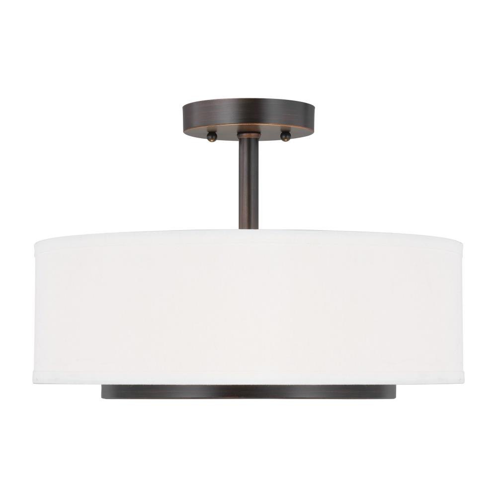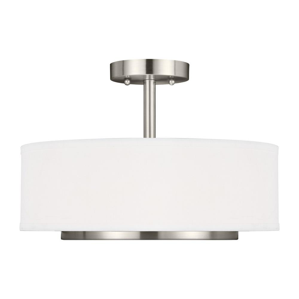 The Nance two light indoor semi-flush convertible in bronze enhances the beauty of your home with ample light and style to match today's trends. The mid-century inspired Nance lighting collection by is a versatile transitional design which fits in a wide array of traditional or contemporary settings. The tapered, off-white, faux silk shades add warmth and sophistication. The large pendant and semi-flush faux silk drum shades are complemented nicely with Satin Etched Opal glass diffusers to soften the downlight. In either of the available Brushed Nickel or Heirloom Bronze finishes, all the Nance fixtures are timeless additions to any foyer, kitchen or dining area. The assortment includes three- five- and nine-light chandeliers; a one-light wall sconce; two- and three-light bath vanities and a two-light semi-flush convertible drum pendant. Incandescent and ENERGY STAR-qualified LED lamping are available; all fixtures are California Title 24 compliant.