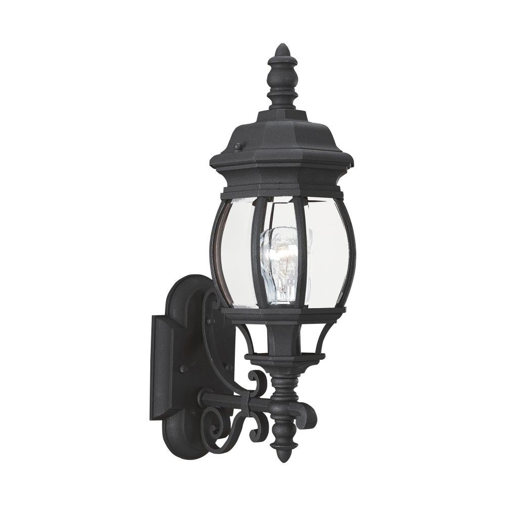 The Wynfield one light outdoor wall fixture in black enhances the beauty of your property, makes your home safer and more secure, and increases the number of pleasurable hours you spend outdoors. The Wynfield collection by complements classical home designs with its soft curves and colonial accents. A Black Powder coat finish over a durable cast aluminum body adds dependable quality to an enduring style. Either Frosted glass or Clear Beveled glass give the fixtures distinct appeal.Product Features and Benefits