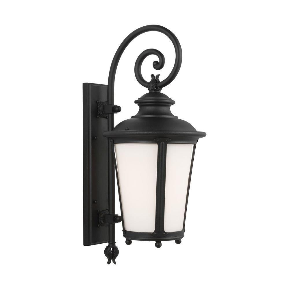 The Cape May one light outdoor wall fixture in black creates a warm and inviting welcome presentation for your home's exterior. The Cape May outdoor lighting collection by is a regal, traditionally styled lantern collection. Design elements include leaf ornamentation on the back plate and finial arms as well as the beautiful combination of the Burled Iron finish and Etched Hammered glass with Light Amber Tint to offer a warm glow. The assortment includes a small one-light outdoor wall lantern (available in a Dark Sky version too), a medium one-light outdoor wall lantern, a large one-light outdoor wall lantern, an extra-large one-light outdoor wall lantern, a one-light outdoor post lantern, a one-light outdoor pendant and a one-light ceiling flush mount. Both incandescent and LED ENERGY STAR-qualified lamping available, and most of these fixtures easily convert to LED.Product Features and Benefits