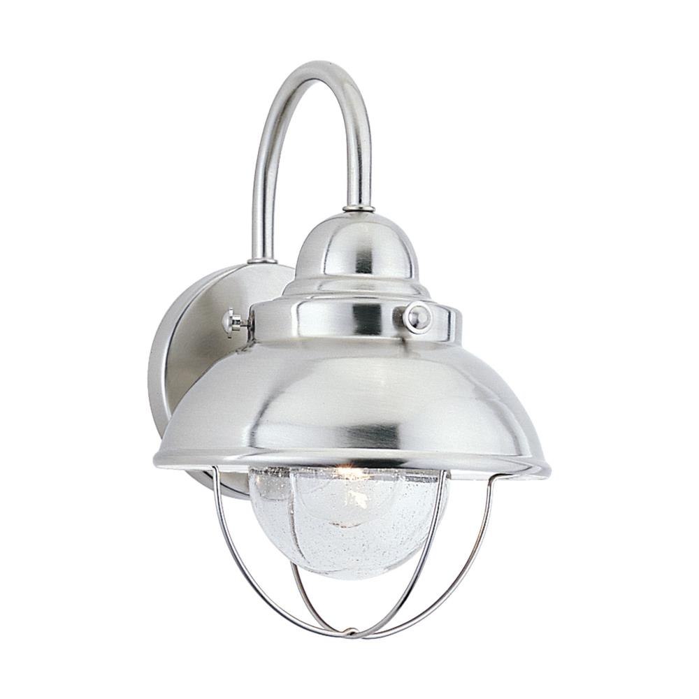 The Sebring one light outdoor wall fixture in black creates a warm and inviting welcome presentation for your home's exterior. This industrial and nautically inspired Sebring collection by coordinates perfectly in coastal locations, while adding eye catching contrast to facades of any kind. Offered in Black, Brushed Stainless and Weathered Copper finishes, Sebring is a complete outdoor collection with small and large one-light outdoor wall lanterns, a one-light outdoor ceiling flush mount and one-light outdoor post lantern to unify any home's appearance. Incandescent as well as integrated LED are available. The advanced, integrated LED light source has warm-on-dim technology that warms in color when dimmed, and is California Title 24 compliant.Product Features and Benefits