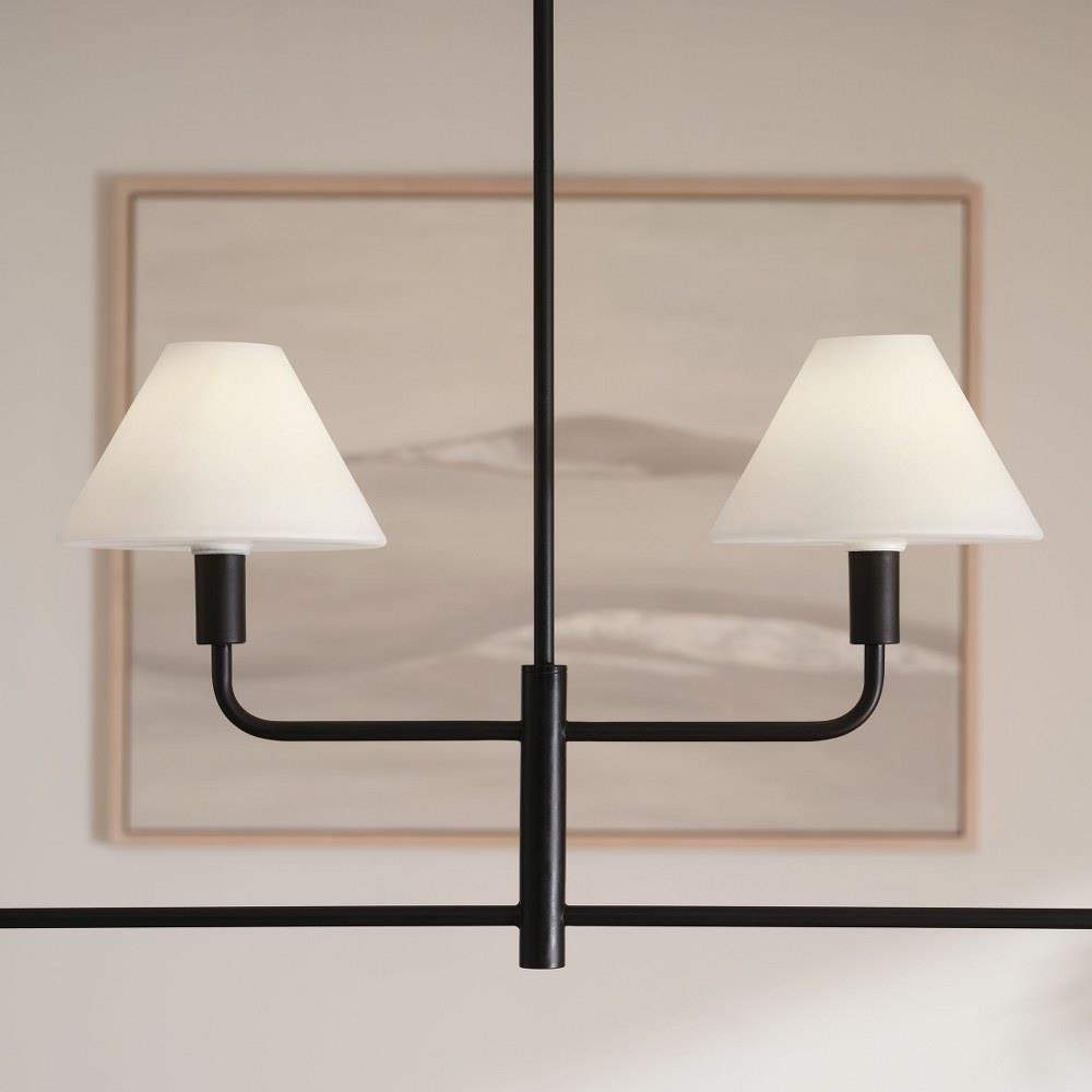 Mendota is a modern take on traditional forms. Its clean lines are paired with conical opal etched glass shades. Available in Midnight Black and Satin Brass and silhouettes from chandeliers to sconces and vanities.