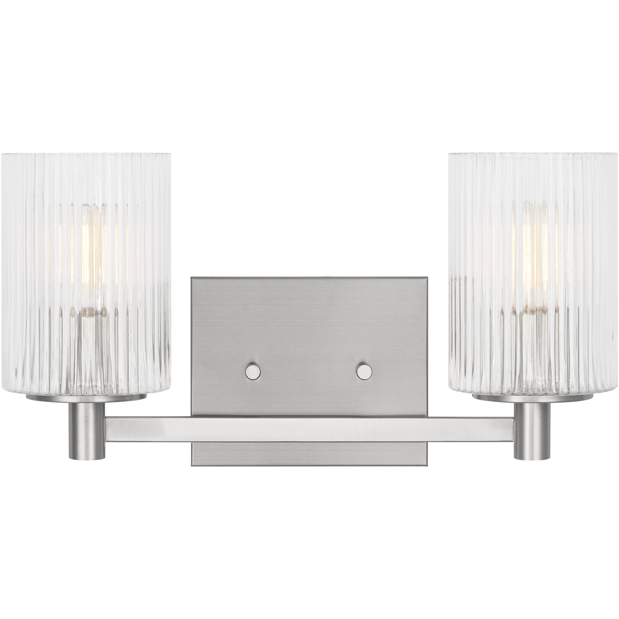 The Generation Lighting Lando 14" 2-light bathroom vanity GLV1042BS in brushed steel is where sophistication meets practicality to redefine your bathroom aesthetic. With fluted glass and four modern finishes, the Lando series seamlessly integrates into your bathroom design, adding a touch of elegance and charm. This transitional fixture will complement bathrooms, bedrooms, and hallways. Safety listed for damp locations and may be mounted in the up or down position.