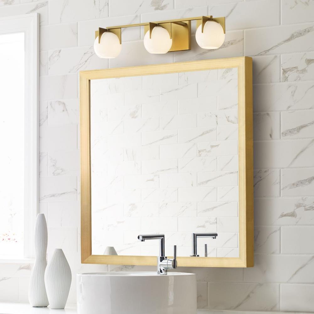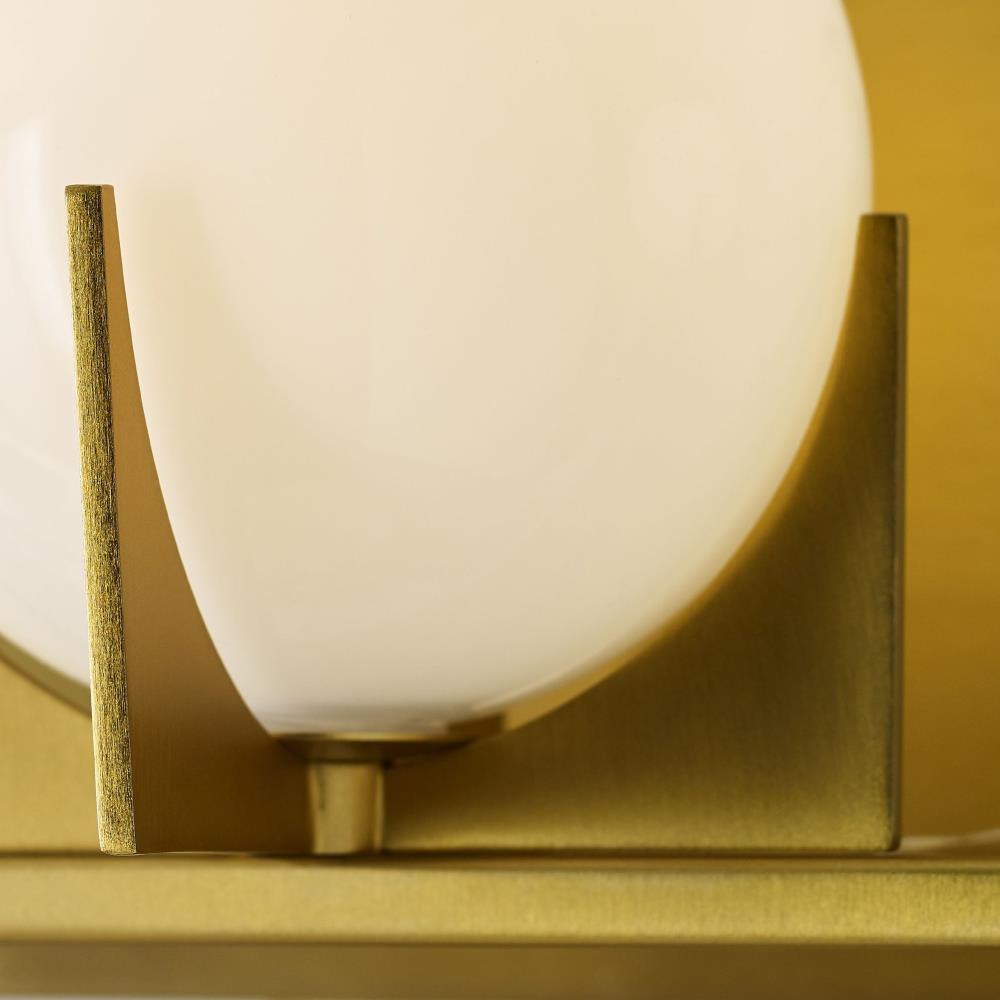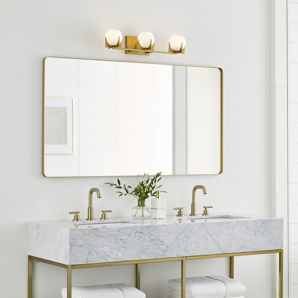 The Abbott three-light vanity fixture in Burnished Brass provides abundant light for your bath vanity while adding a layer of today's style to your interior design. An updated take on a retro design, the Abbott vanity lights bring a splash of mid-century modern inspiration to your decor. Crafted of metal and suited for damp spaces, this streamlined fixture is offered in three sizes to fit comfortably above a vanity or single as a sconce—round-shaped milk glass shades in a satin hue complete the look and diffuse brightness.Product Features and Benefits
