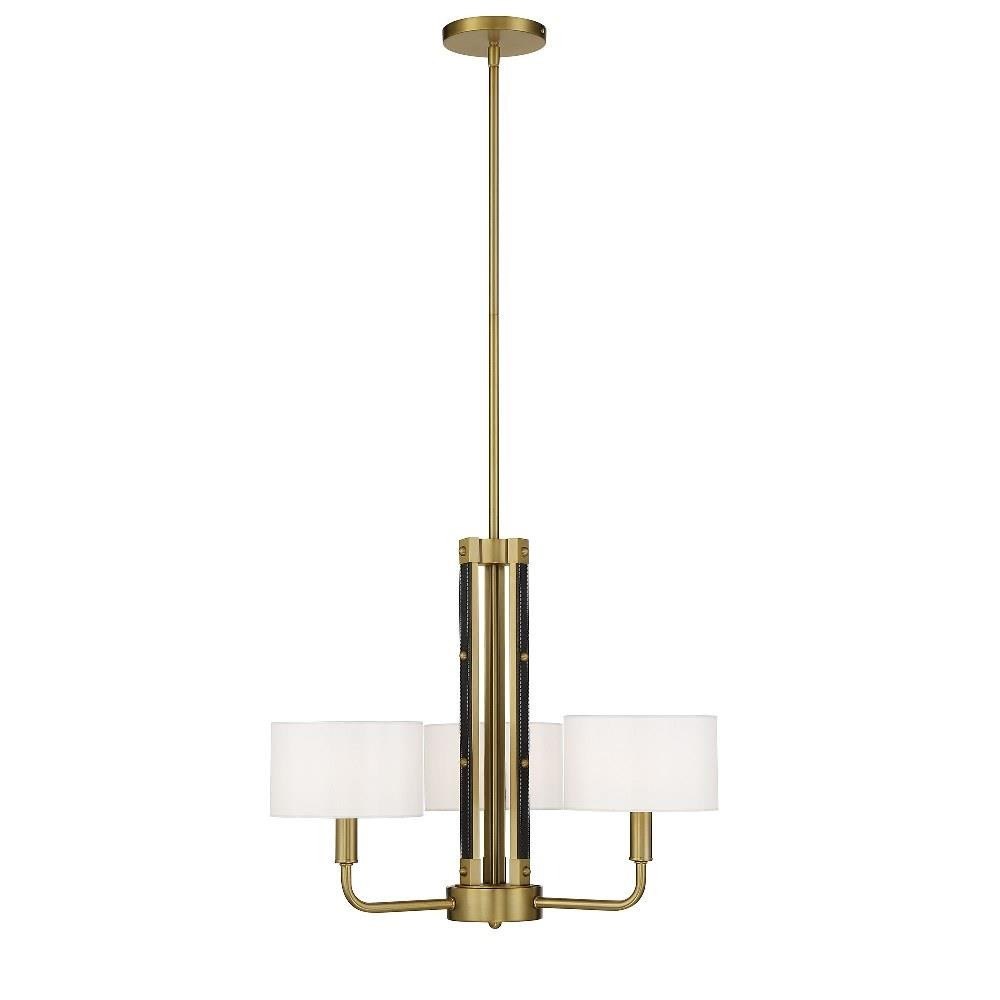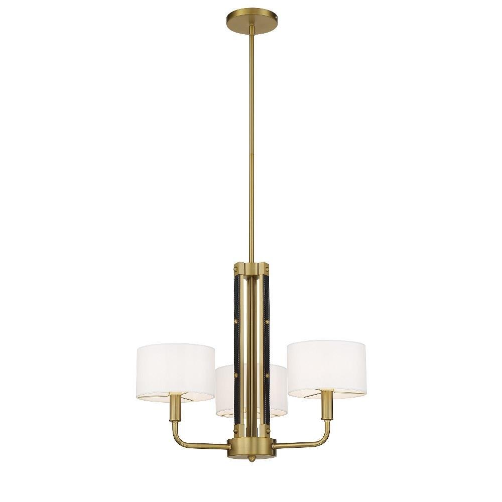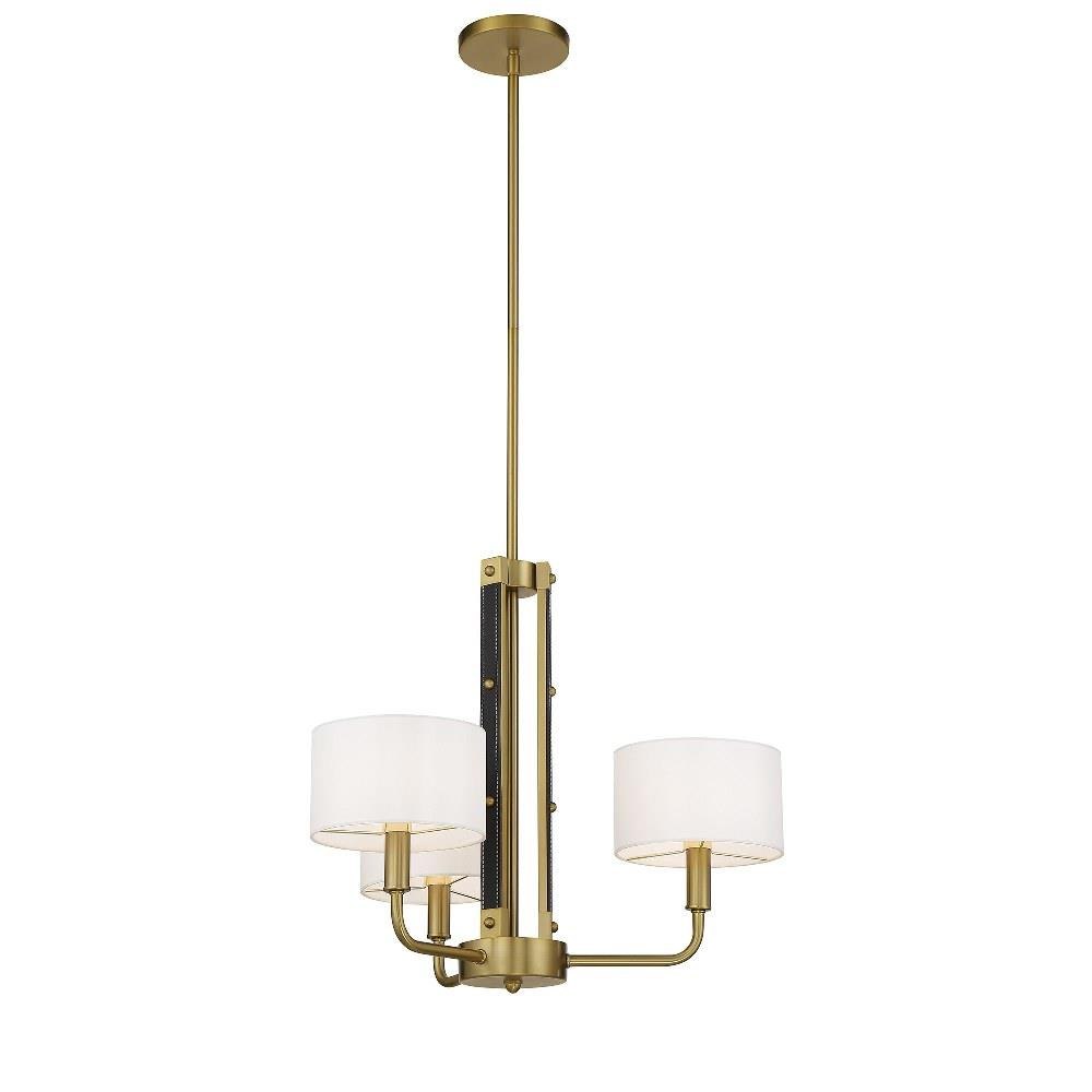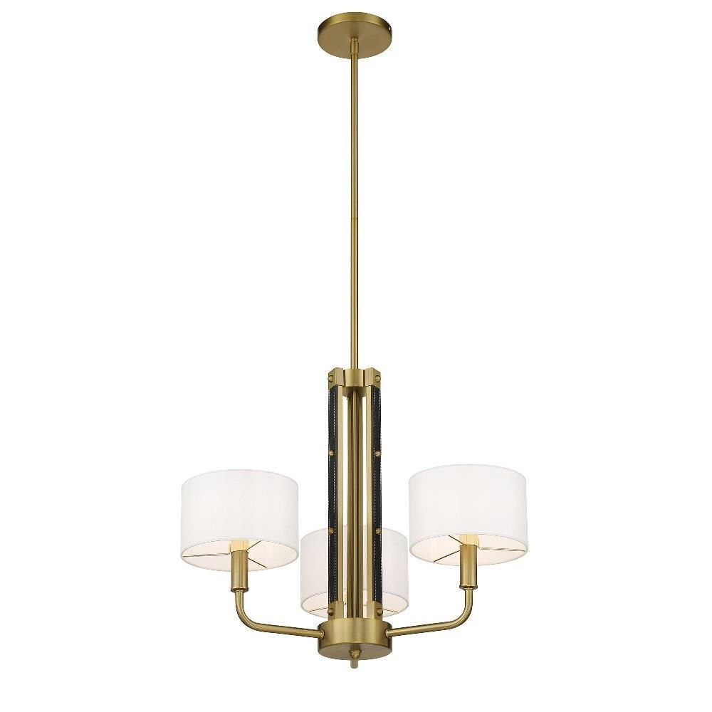 Introducing the Chelsea 3 Light Chandelier, a stunning blend of contemporary and mid-century modern design. Standing 18 inches tall and 22 inches wide, this chandelier features a sophisticated combination of fabric, leather, and steel materials, creating a striking focal point in any room. With three incandescent bulbs, it offers ample illumination while showcasing its armed, shaded design. Elevate your space with the elegance and style that the Chelsea collection brings.