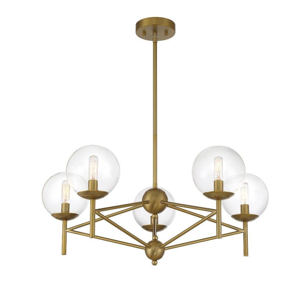 Introducing the Auresa 5 Light Pendant, a stunning addition to your space. Standing 12 inches tall and 29 inches wide, this pendant features a harmonious blend of glass and steel, embodying both coastal and transitional styles. The exposed bulb design enhances its modern aesthetic, while the shaded elements provide a warm ambiance. With a capacity for five incandescent bulbs, this fixture illuminates your environment with elegance and charm, making it perfect for any room.