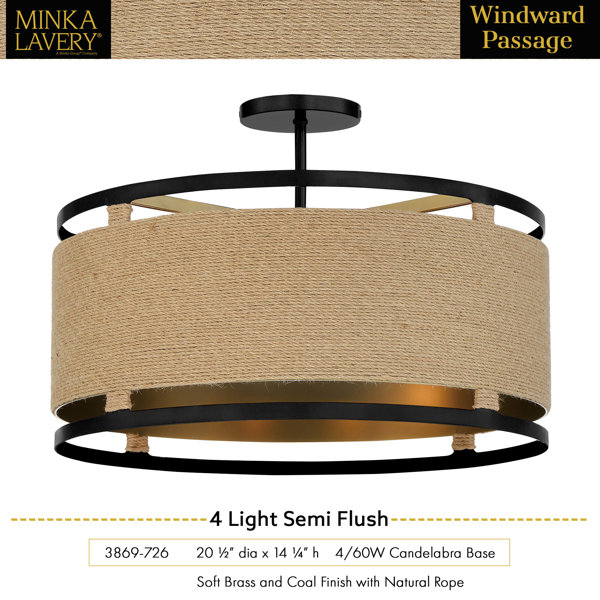 Add a touch of elegance to your home with the Minka Lavery Windward Passage 4 Light Semi-Flush Ceiling Fixture. The drum shade, wrapped in natural rope, is framed by a sleek black metal design that adds bold contrast and visual interest. Inside, a warm gold lining enhances the light's glow, creating a cozy and inviting ambiance for your space.