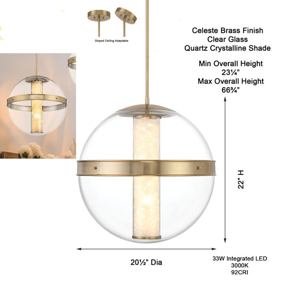 Illuminate your space with the ethereal elegance of this globe-inspired pendant light. Featuring a radiant brushed brass band encircling a clear glass sphere, this piece is the epitome of modern luxury. At its core lies a column of softly illuminated natural crystals, emitting a warm, ambient glow that transforms any room into a haven of sophistication. The seamless blend of natural textures and polished finishes makes this pendant light a standout in contemporary and transitional interiors alike. Whether it’s suspended above a dining table, gracing an entryway, or providing soft illumination in a luxurious bedroom, this fixture creates an atmosphere of timeless beauty and refined taste.