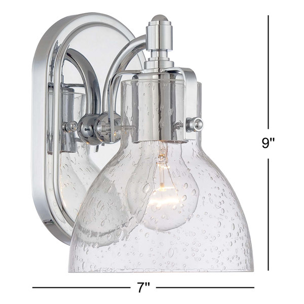 Brighten up your bathroom vanity with this 1-light chrome bath sconce. Made of steel with a chrome finish, this 9" H sconce has a classic dome silhouette for classic coastal style. It features an oval-shaped backplate and a curved arm that connects to a clear, seeded glass shade. Inside, a standard bulb up to 100W (sold separately) illuminates your bathroom. Best of all, it's compatible with a dimmer switch so you can adjust the light from your morning routine to a before-bed bubble bath.