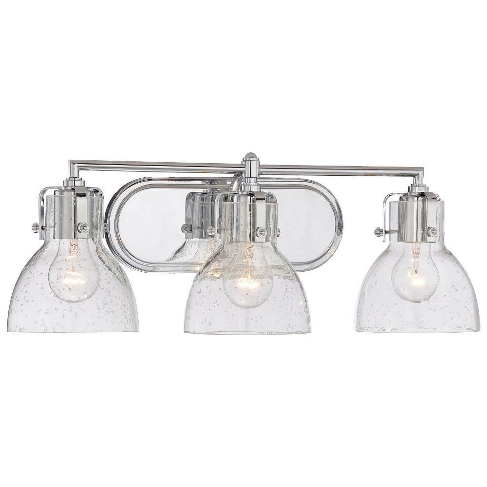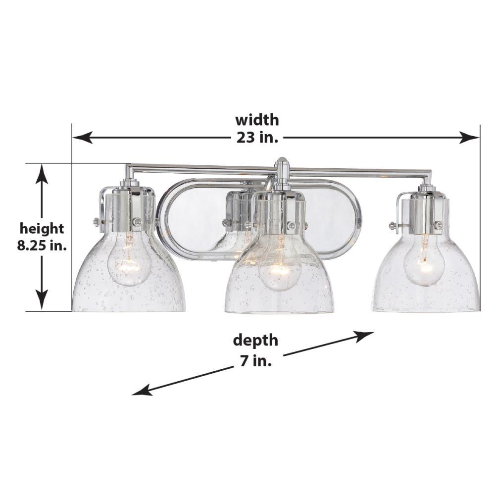 Introducing the 5723-77, a stunning addition to your home decor from the Vanity Lights collection. This transitional-style wall light features three incandescent bulbs, providing ample illumination while adding a contemporary touch. Crafted from durable glass and steel, it stands 8.25 inches tall and spans 23 inches wide, making it an ideal fit for any bath vanity. The exposed bulb design, complemented by elegant shades, enhances its aesthetic appeal, blending functionality with style seamlessly.