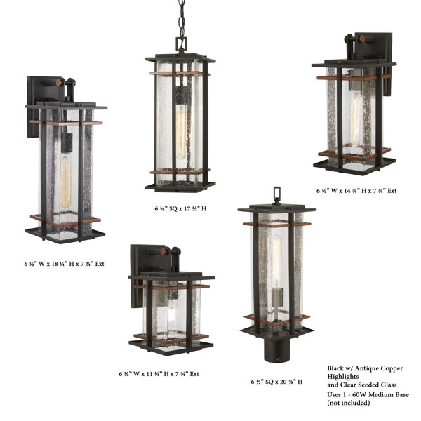 The Plaisance 1-light outdoor wall mount from Minka-Lavery brings an architectural flavor to the traditional lantern-style wall light. A rectangular coal black frame with antique copper accents houses one 60-watt ST58 bulb behind clear seeded glass panes to create a strong and welcoming presence. The Plaisance exterior wall sconce is well-suited for the challenging weather conditions of outdoor use thanks to its hardy aluminum and glass construction.